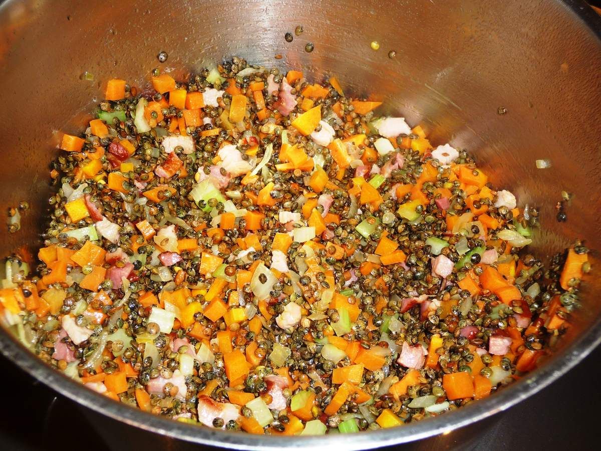 3) Ajouter les lentilles, 7,5dl d’eau, le bouquet garni, le cube de bouillon et poivrer un peu. Dès l’ébullition, baisser le feu à frémissements et laisser cuire ainsi à découvert entre 30 et 45 minutes.