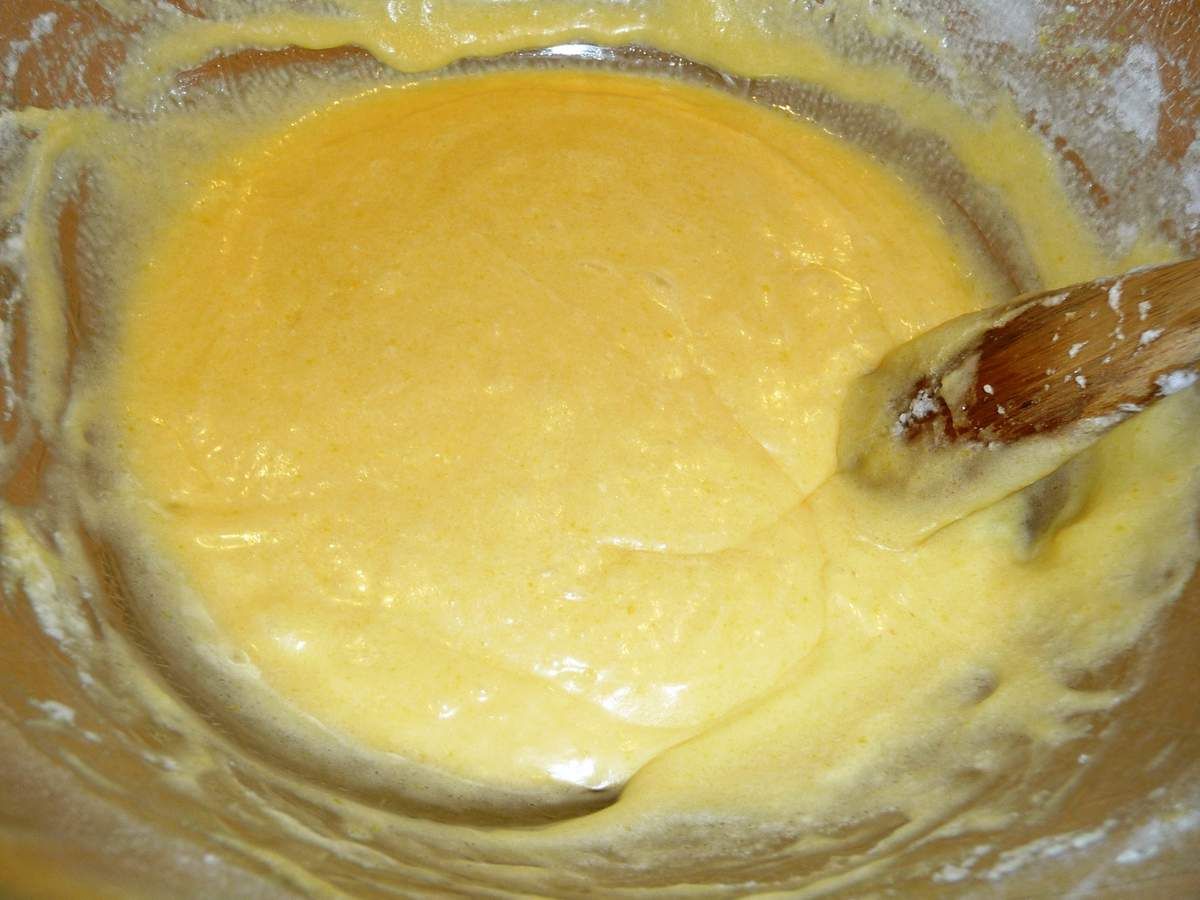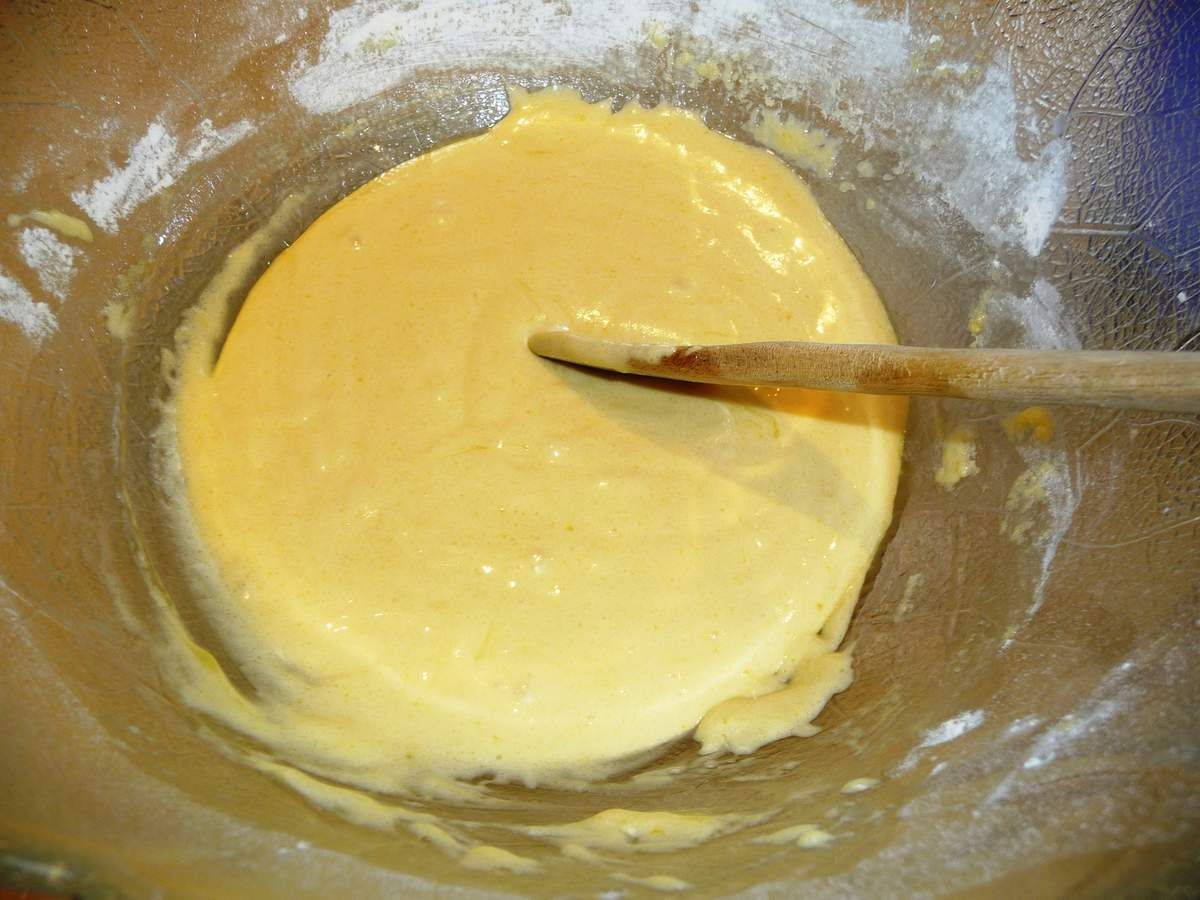 2) Faire fondre le beurre dans une petite casserole à feu doux. Laisser tiédir. Ajouter dans le mélange jaunes d'oeufs-sucre. Mélanger avec une spatule. Ajouter les 4 càs de lait et mélanger. Mélanger la farine avec la poudre à lever et ajouter. Bien mélanger avec une spatule jusqu'à ce que la pâte soit uniforme.