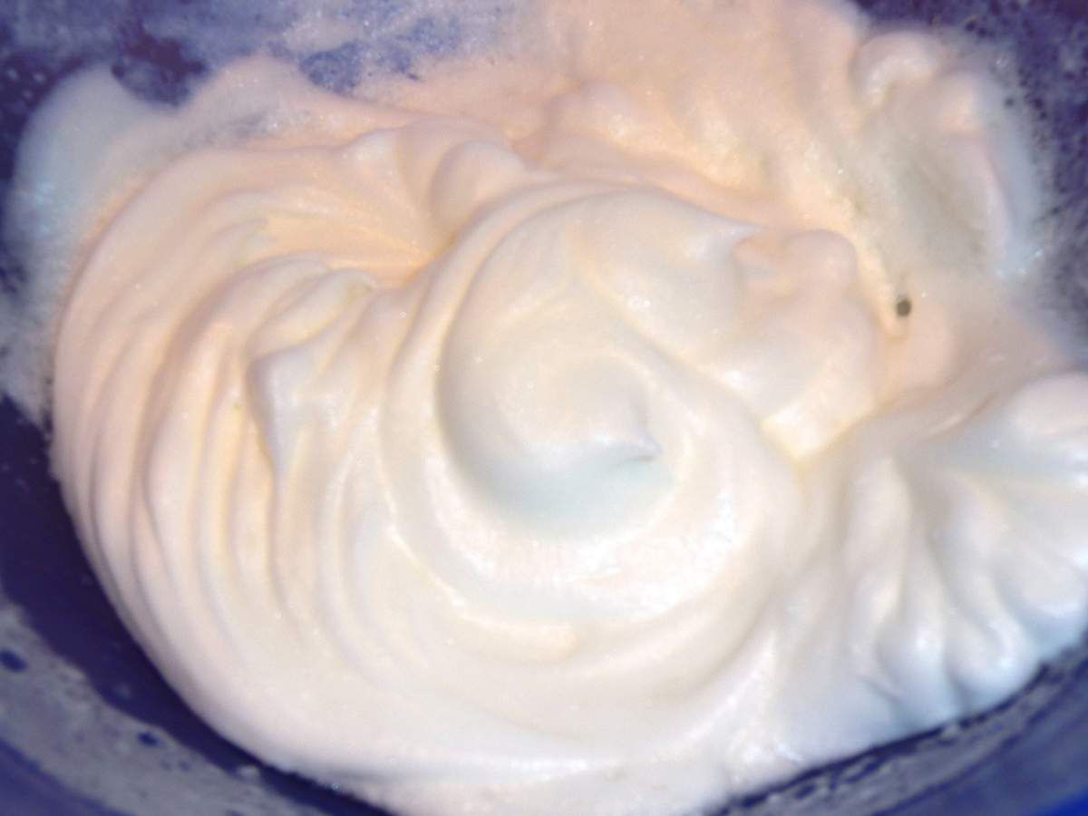 3) Monter les blancs en neige ferme au batteur électrique en ajoutant une pincée de sel. S'ils sont fermes, c'est que vous pouvez retourner le plat sans qu'ils ne bougent. Essayez c'est très drôle (surtout s'ils ne sont pas fermes). Hihihi.