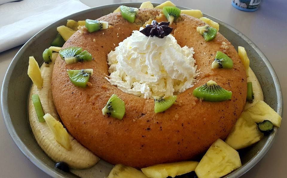 8) Mettre le biscuit dans un récipient plat et profond de quelques centimètres (je l'ai mis dans un moule à tarte). Avec une louche, verser un peu de sirop chaud dessus. Attendre un peu, répéter l'opération. Laisser imbiber. Une heure plus tard, procéder de la même façon et ainsi de suite durant 3 heures environ. Vous aurez probablement trop de sirop, mais peu importe, vous jetterez le reste. Le biscuit sera bien imbibé si lorsque vous appuierez dessus, vous sentirez qu'il est bien mou et ... mouillé. Vous pouvez à ce moment là, en laissant le sirop qui est dans le fond du plat, le mettre au réfrigérateur quelques heures. Frais, c'est meilleur. Je l'ai même gardé encore jusqu'au lendemain et il était parfait.