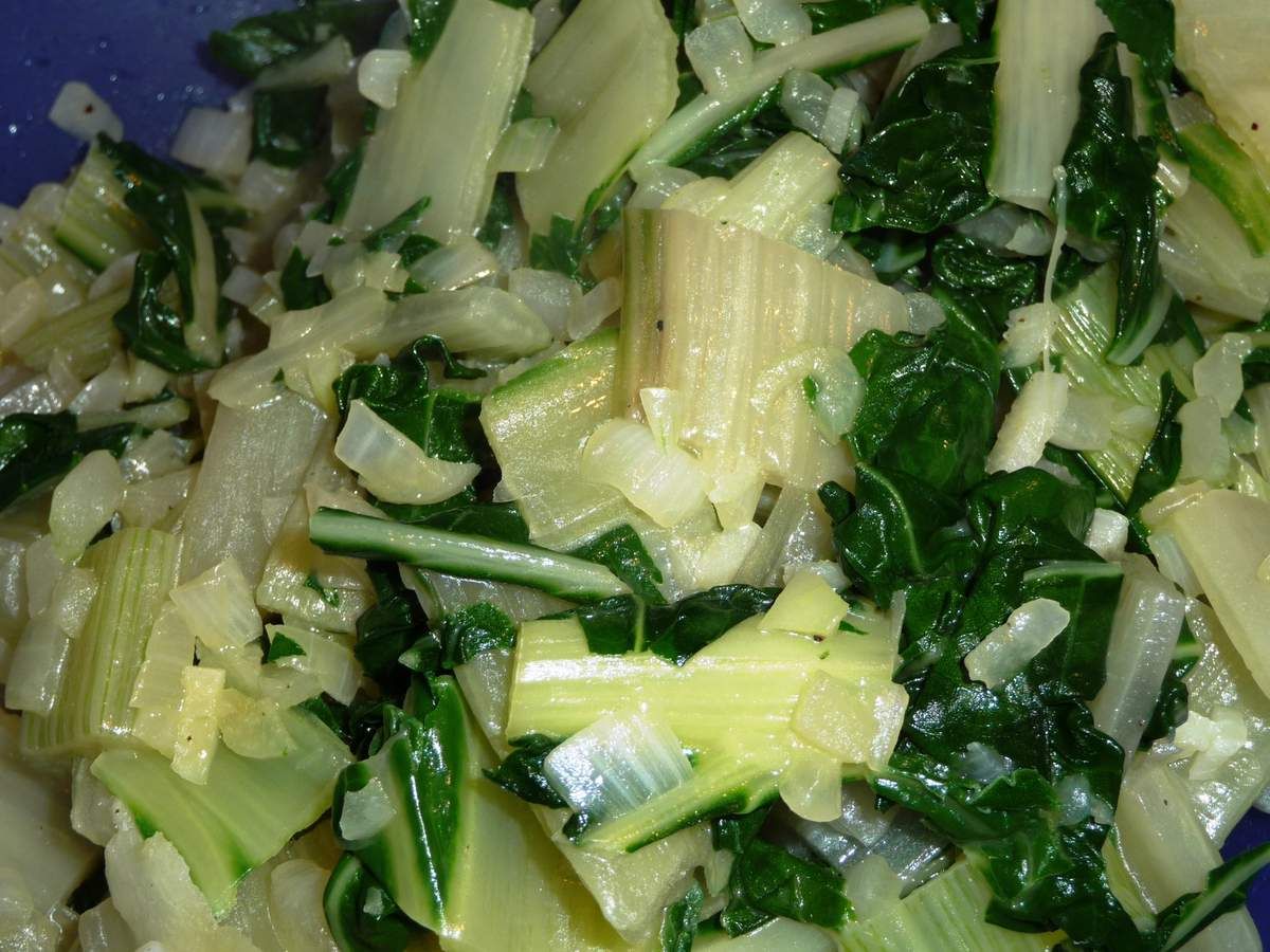 1) Préparer les côtes de bettes: les laver soigneusement, séparer les feuilles vertes de la côte blanche. Avec un petit couteau ou un économe, peler légèrement les côtes blanches de haut en bas pour enlever les fils de la première couche (comme pour la rhubarbe). Couper en petits carrés les blancs. Ciseler grossièrement les feuilles vertes.