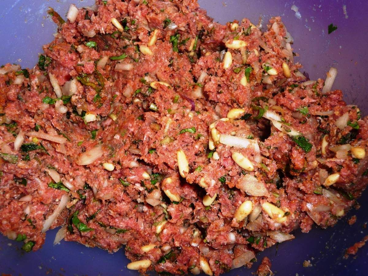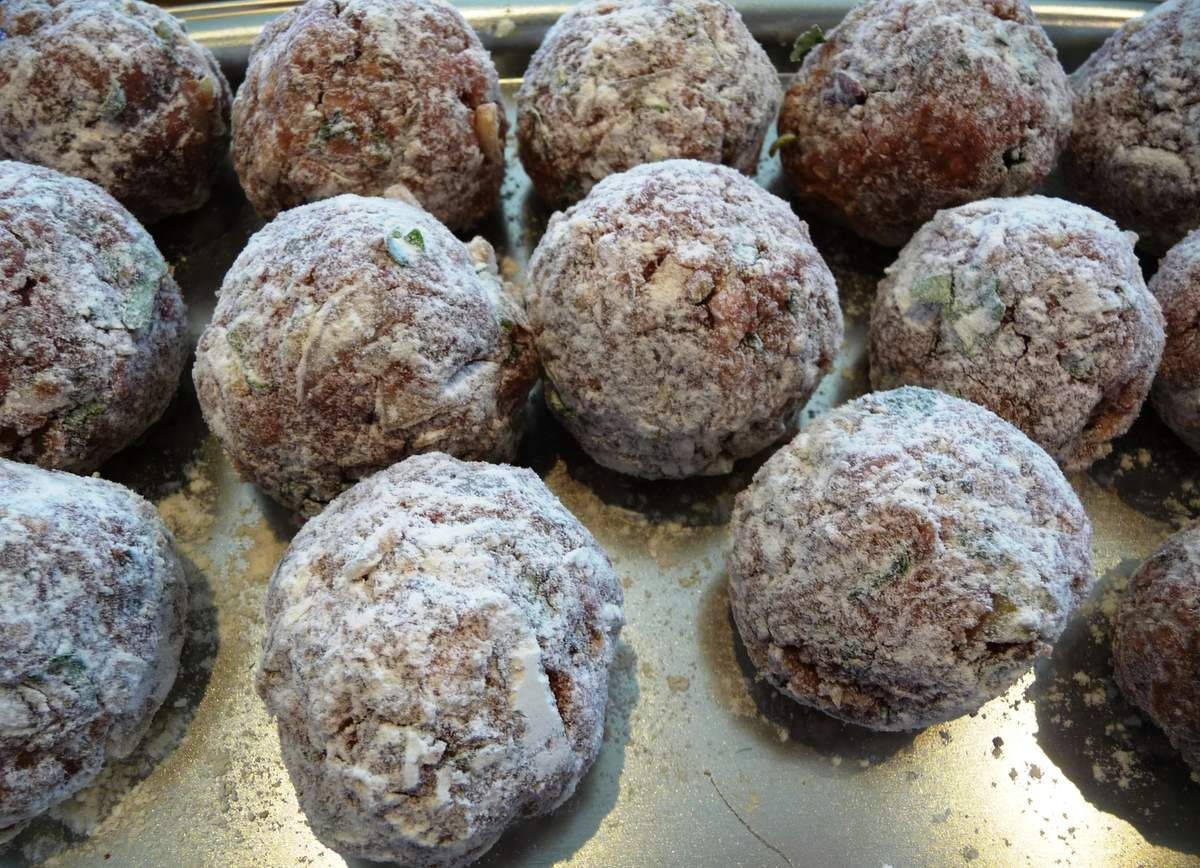7) Les boulettes: mélanger tous les ingrédients dans un grand récipient. Mettre de la farine dans une assiette creuse. Façonner dans la paume de vos mains des boulettes de la taille d'une noix. Les passer dans la farine.