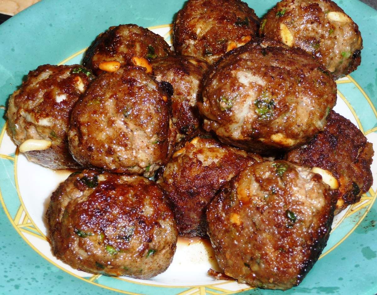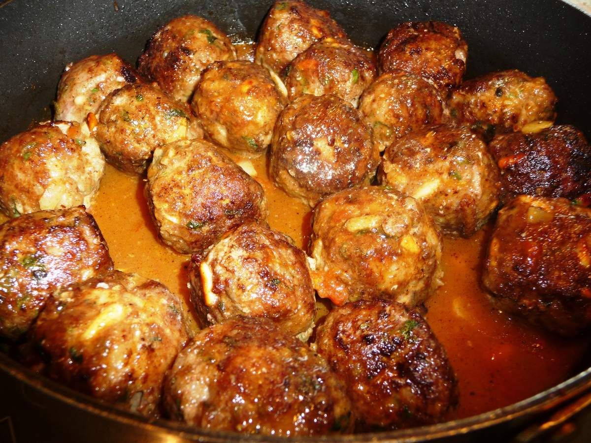 8) Dans une poêle, faire chauffer de l'huile à rôtir et faire revenir les boulettes sur toutes les faces jusqu'à ce qu'elles soient dorées (environ 10 minutes). Procéder en plusieurs fois si nécessaire. Essuyer à chaque fois la poêle avec du papier ménage et remettre un peu d'huile à rôtir. Remettre toutes les boulettes dans la poêle et ajouter 4 louches du jus du couscous. Laisser cuire à petit feu 5 minutes et réserver.