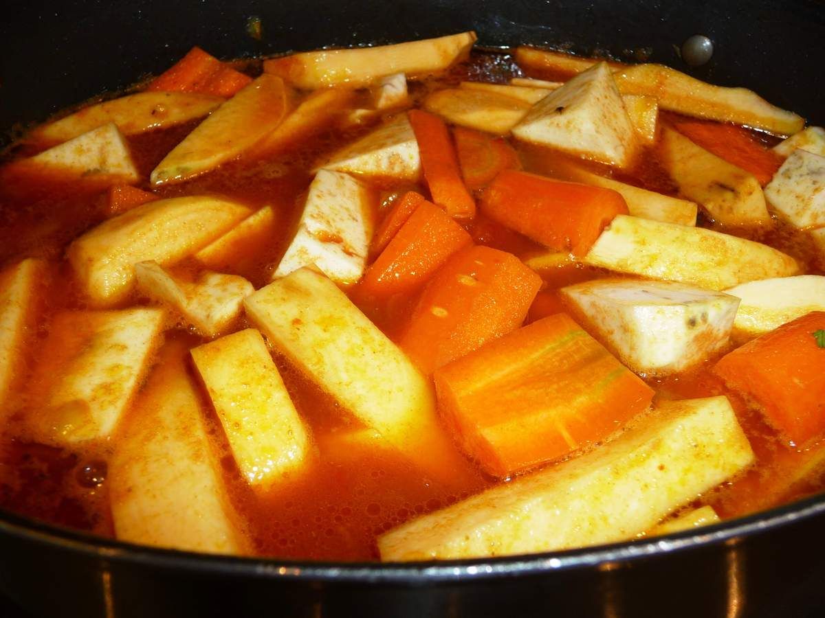 5) Pendant ce temps: peler les carottes, les couper en 2 dans la longueur puis en tronçons d'environ 4 cm. Peler le céleri et les colraves et couper des morceaux de même épaisseur que les carottes. Après les 15 minutes de cuisson du point 4, ajouter tous ces légumes dans la casserole. Mélanger et toujours à couvert, cuire sur feu doux 20 minutes.