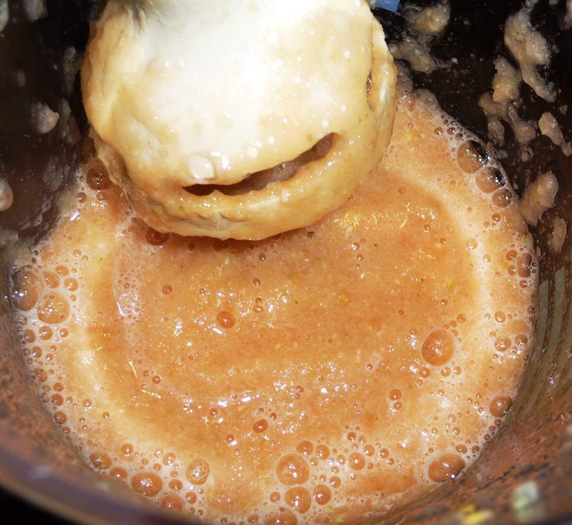 2) Peler et hacher grossièrement oignon et ail. Mettre dans le récipient contenant la chair des légumes. Mixer le tout avec un plongeur. Egoutter le mélanger à travers une passoire pour éliminer le maximum de jus. Dans une poêle, mettre un filet d’huile d’olive et faire revenir ce mélange quelques minutes en salant et poivrant et en ajoutant un petit peu d’herbes de Provence. Lorsque les légumes ont rendu toute leur eau, arrêter le feu et laisser refroidir (au moins tiédir). Le mélange doit avoir la consistance d’une pâte.