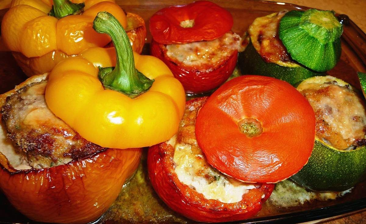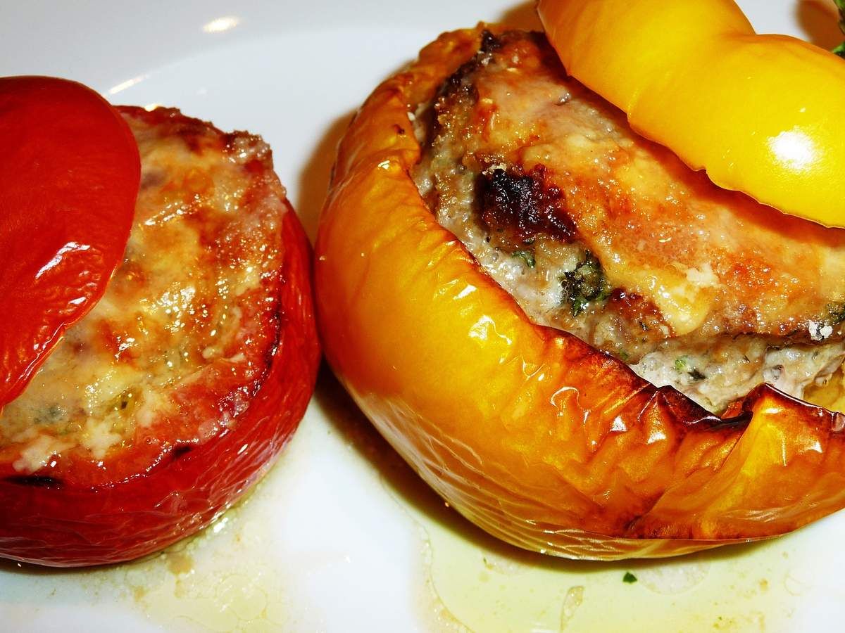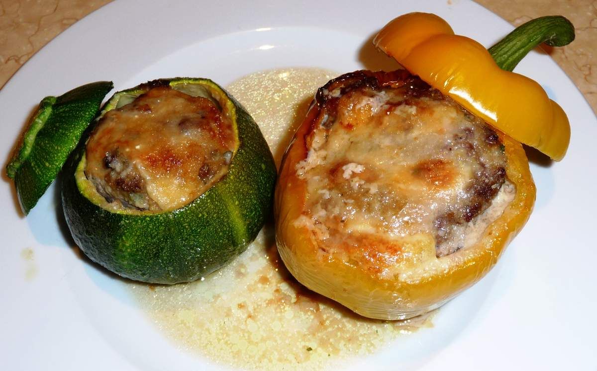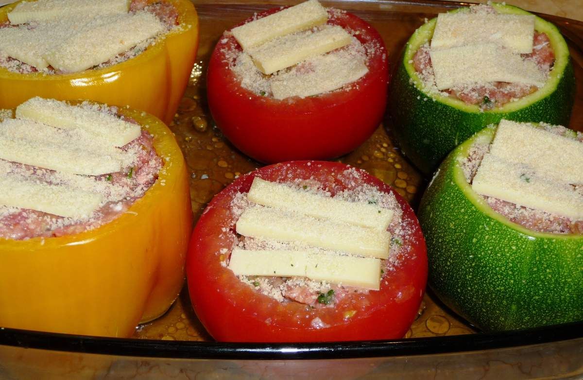 5) Préchauffer le four à 180°C. Dans un plat à gratin, mettre un filet d’huile d’olive, ajouter un filet d’eau (juste un petit fond) et émietter le demi-bouillon. Disposer les légumes dans le plat. Les farcir du mélange généreusement. Disposer une lamelle de gruyère sur chaque légume et saupoudrer d’un peu de chapelure. Enfourner. Après 45 minutes, ajouter les chapeaux et cuire encore 15 minutes. Servir avec du riz ou des pommes-de-terre sautées par exemple… Ou avec un bon morceau de pain, cela suffit !