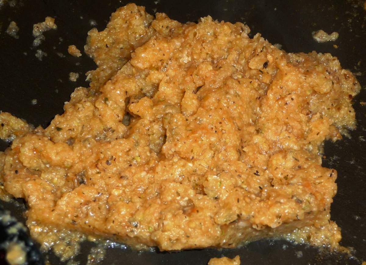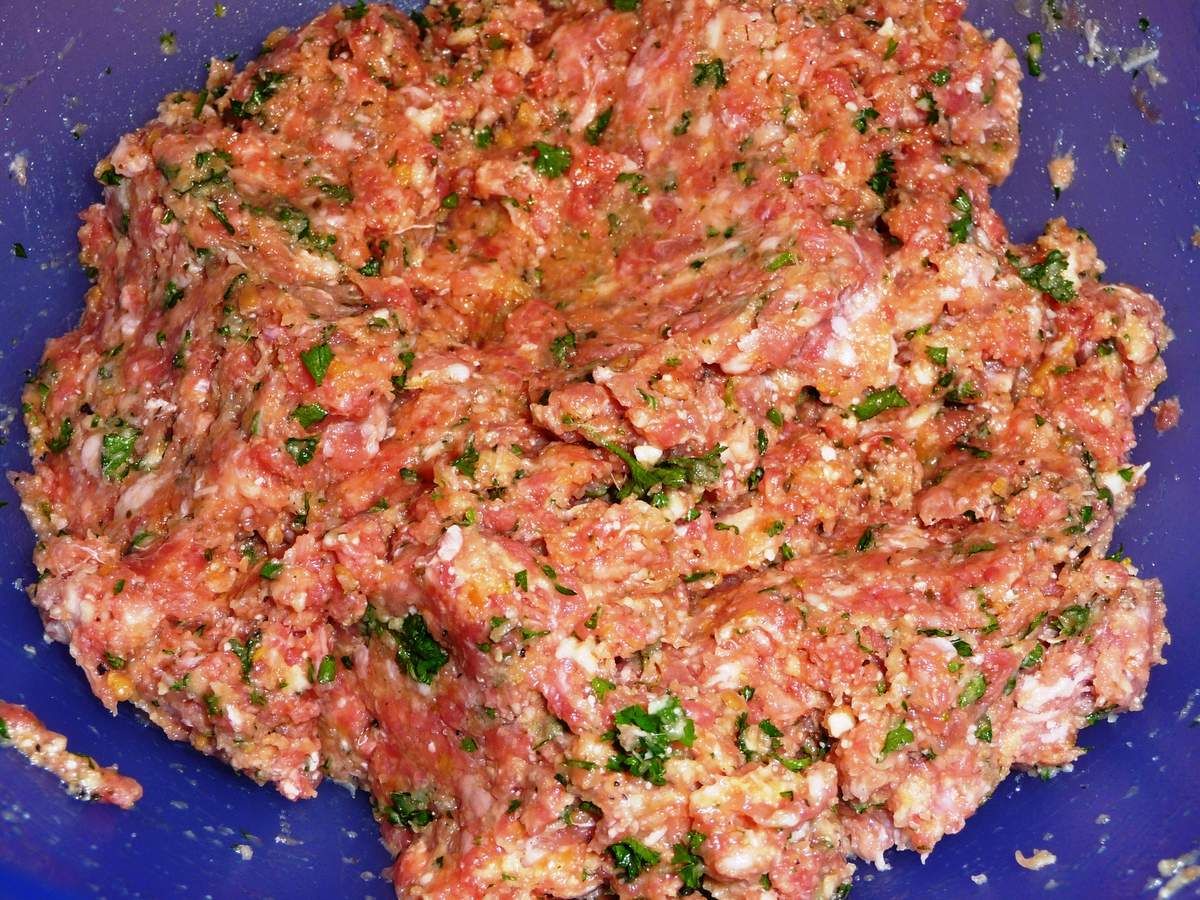 4) Dans un grand récipient, mettre la viande hachée, la saucisse à rôtir dont vous aurez enlevé la peau, le persil haché, l’œuf ou les oeufs entiers, la mie de pain essorée entre vos doigts, 1 càs de chapelure, le parmesan et le mélange de chair de légumes. Bien mélanger, poivrer et saler.