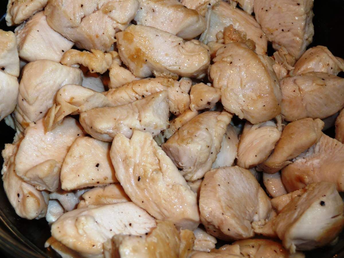 1) Couper le blanc de poulet en dés et le faire revenir avec un peu de beurre à rôtir 3-4 minutes dans une poêle sur feu vif. Saler et poivrer et réserver dans un bol.