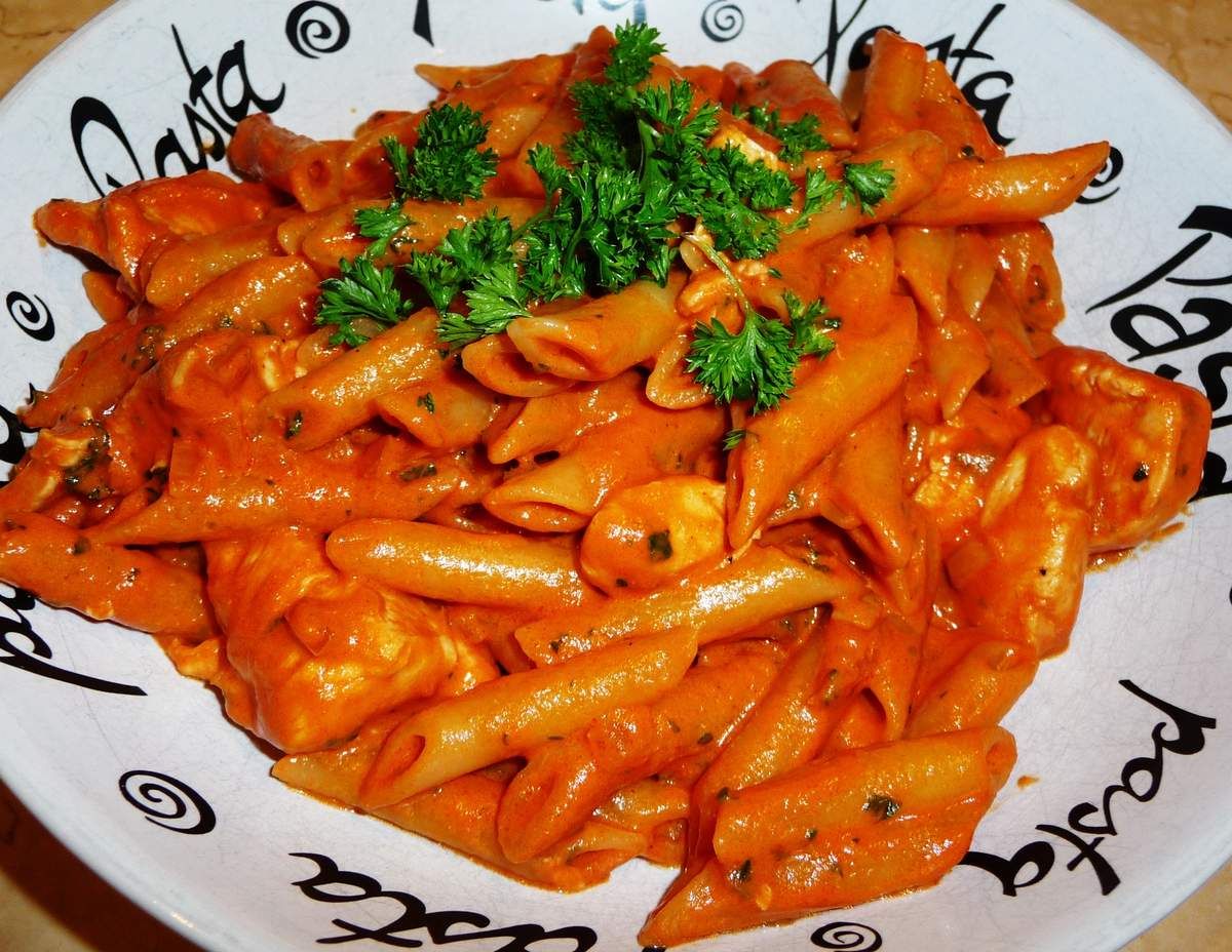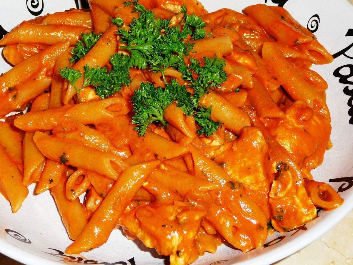 4) Remettre le poulet dans la poêle, ajouter 2 càs de vodka et le persil. Goûter et rectifier l'assaisonnement selon vos goûts (sel, poivre, paprika, Tabasco). Cuire encore 2 minutes pour que le poulet soit bien chaud. Egoutter les pâtes al dente et les mélanger à la sauce soigneusement. Servir dans des assiettes creuses avec du parmesan.