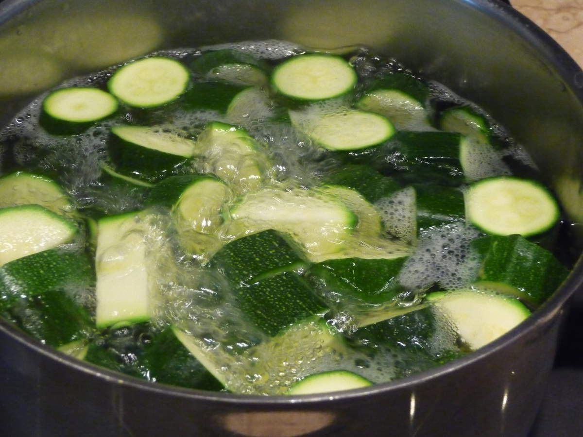 1) Passer les courgettes sous l'eau froide. Les couper en deux puis en tronçons. Dans une casserole, verser 8dl d'eau. Lorsque l'eau est à ébullition, ajouter les courgettes et 2 càc de sel. Couvrir et cuire à feu moyen 20 minutes.