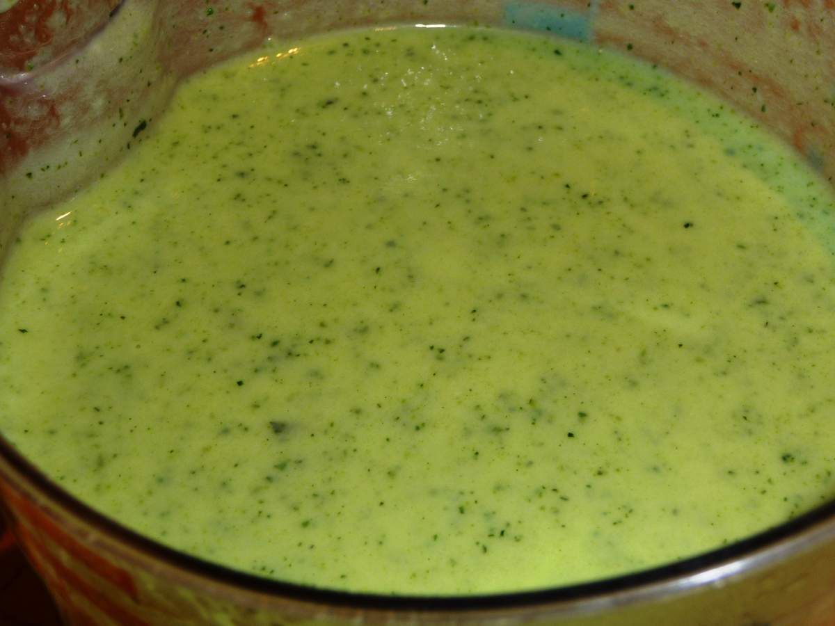 3) Revenons à nos courgettes. Après 20 minutes de cuisson, les mettre dans un récipient haut AVEC le jus de cuisson ou les laisser dans la casserole. Ajouter 200g de ricotta, 7 feuilles de menthe, poivrer. Mixer le tout finement avec un plongeur ou mettre le mélange dans un blender. Goûter et rectifier l'assaisonnement. Réfrigérer au moins 4 heures pour que le velouté soit bien froid.
