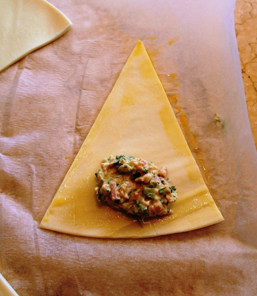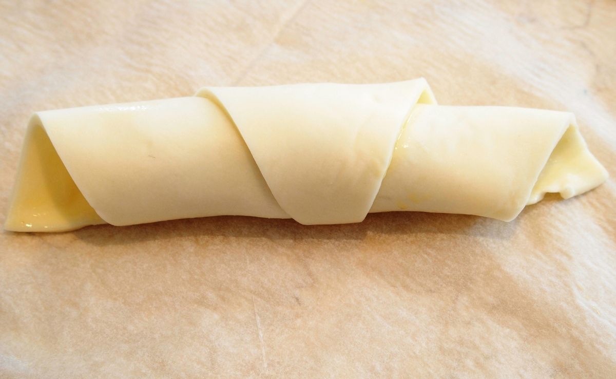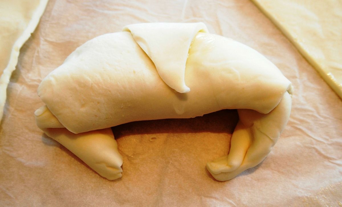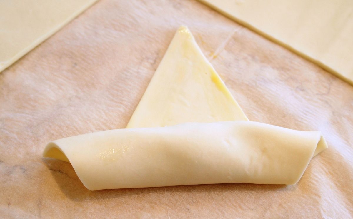 2) Préchauffer le four à 200°C. Disposer une abaisse de pâte feuilletée sur le plan de travail et la découper en 8 parts égales (avec une règle c'est parfait). Mélanger l'oeuf dans un bol avec une fourchette. A l'aide d'un pinceau, badigeonner le bord du triangle sur ses trois côtés. Déposer une cuillère à café de farce en bas du triangle. Rouler en tenant fermement le croissant jusqu'au bout. Replier les bords contre l'arrière du croissant puis les faire revenir en avant en les tournant légèrement sur eux-mêmes. Comme ça: