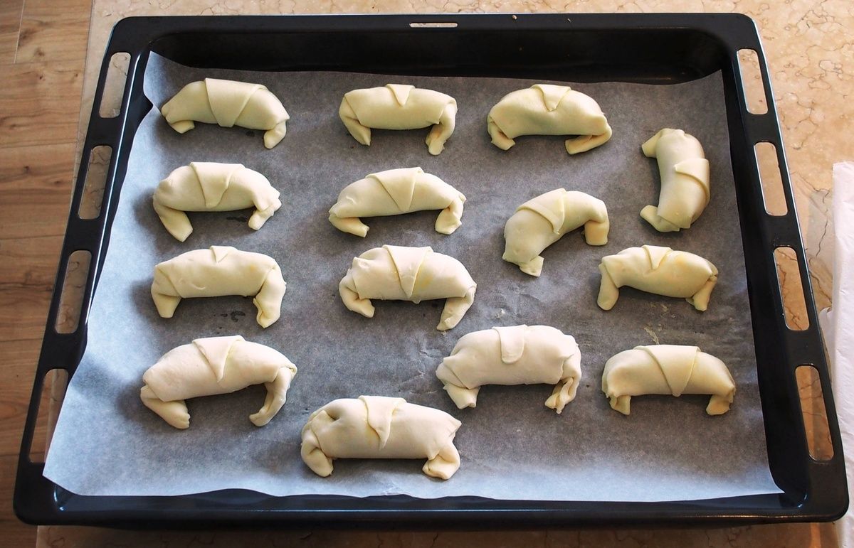 3) Renouveler l'opération jusqu'à épuisement de la farce. Mettre les croissants sur une plaque recouverte de papier sulfurisé et les badigeonner d'oeuf avec un pinceau. Enfourner pour 25 minutes dans le four  à 200°C. Sortir et laisser refroidir. Déguster.