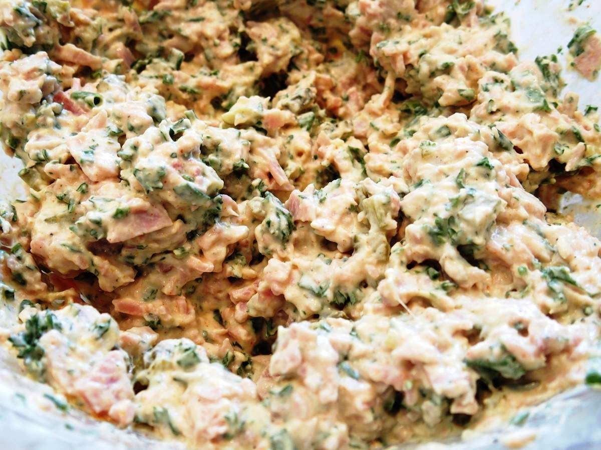 1) Préparer la farce: hacher le jambon finement. Couper les cornichons en petits dés. Hacher persil et ciboulette. Tout mettre dans un bol avec le Philadelphia que vous aurez détendu avec une fourchette. Ajouter la moutarde. Saler, poivrer, saupoudrer de paprika et curry. Ajouter une tombée de crème si l'ensemble vous paraît trop dense. Goûter et rectifier l'assaisonnement.