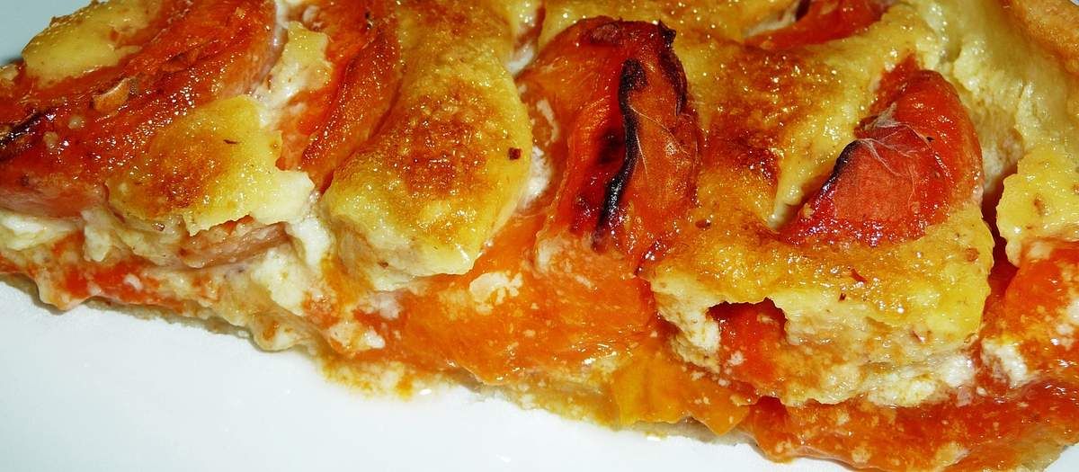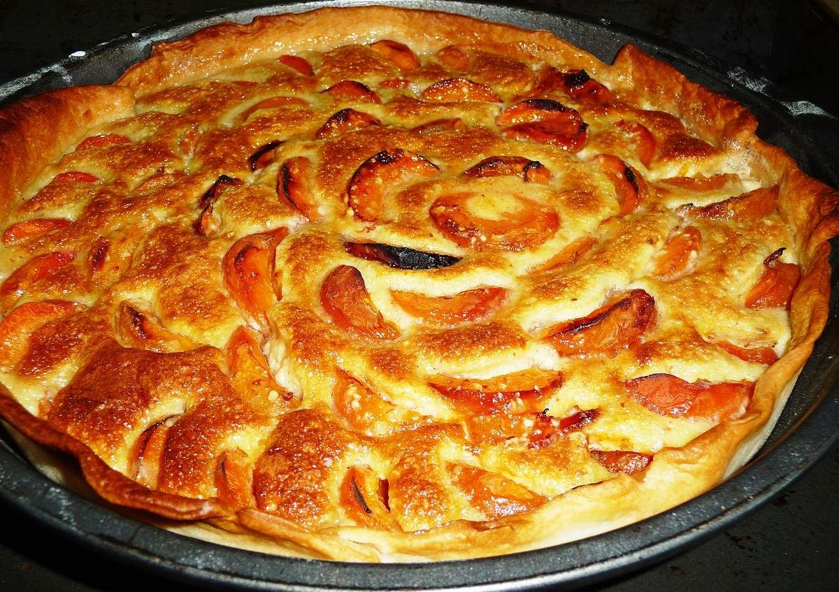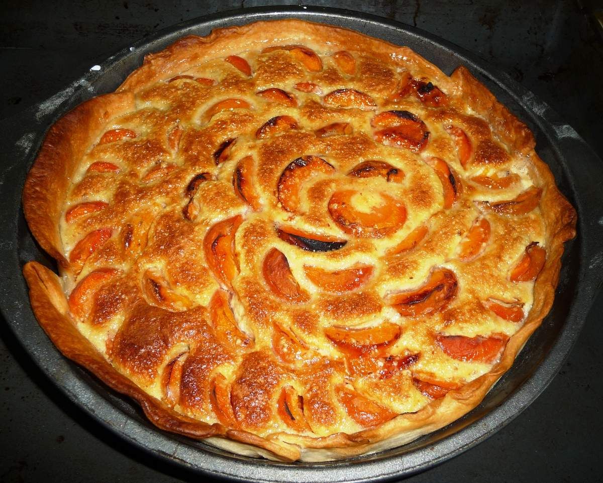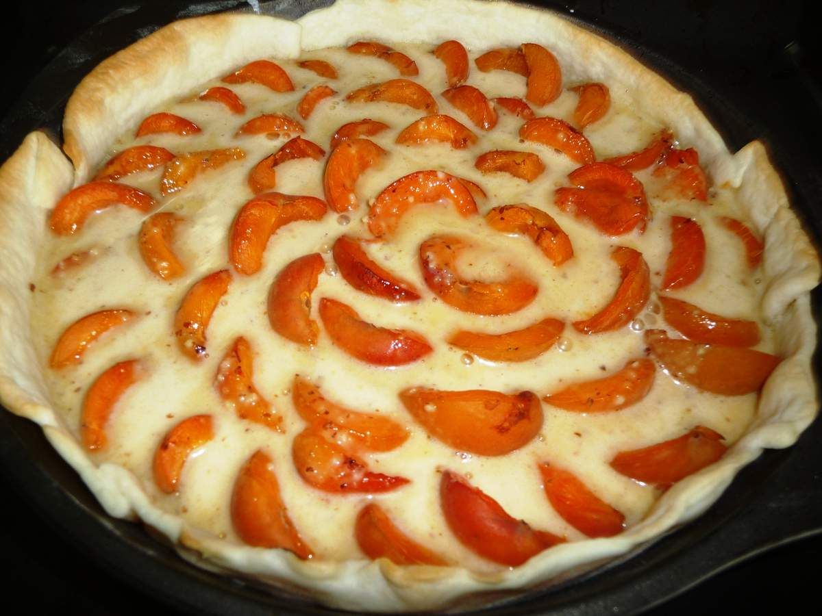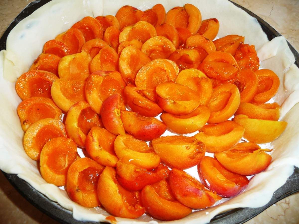 1) Préchauffer le four à 210°C. Beurrer et fariner votre moule à tarte. Y déposer le disque de pâte en appuyant bien sur les bords. Piquer le fond avec une fourchette de toute part. Saupoudrer le fond avec la maïzena. Laver les abricots, les couper en deux dans la longueur. Retirer le noyau et garnir le fond de tarte avec les moitiés des abricots de façon à ce qu'elles se chevauchent légèrement.