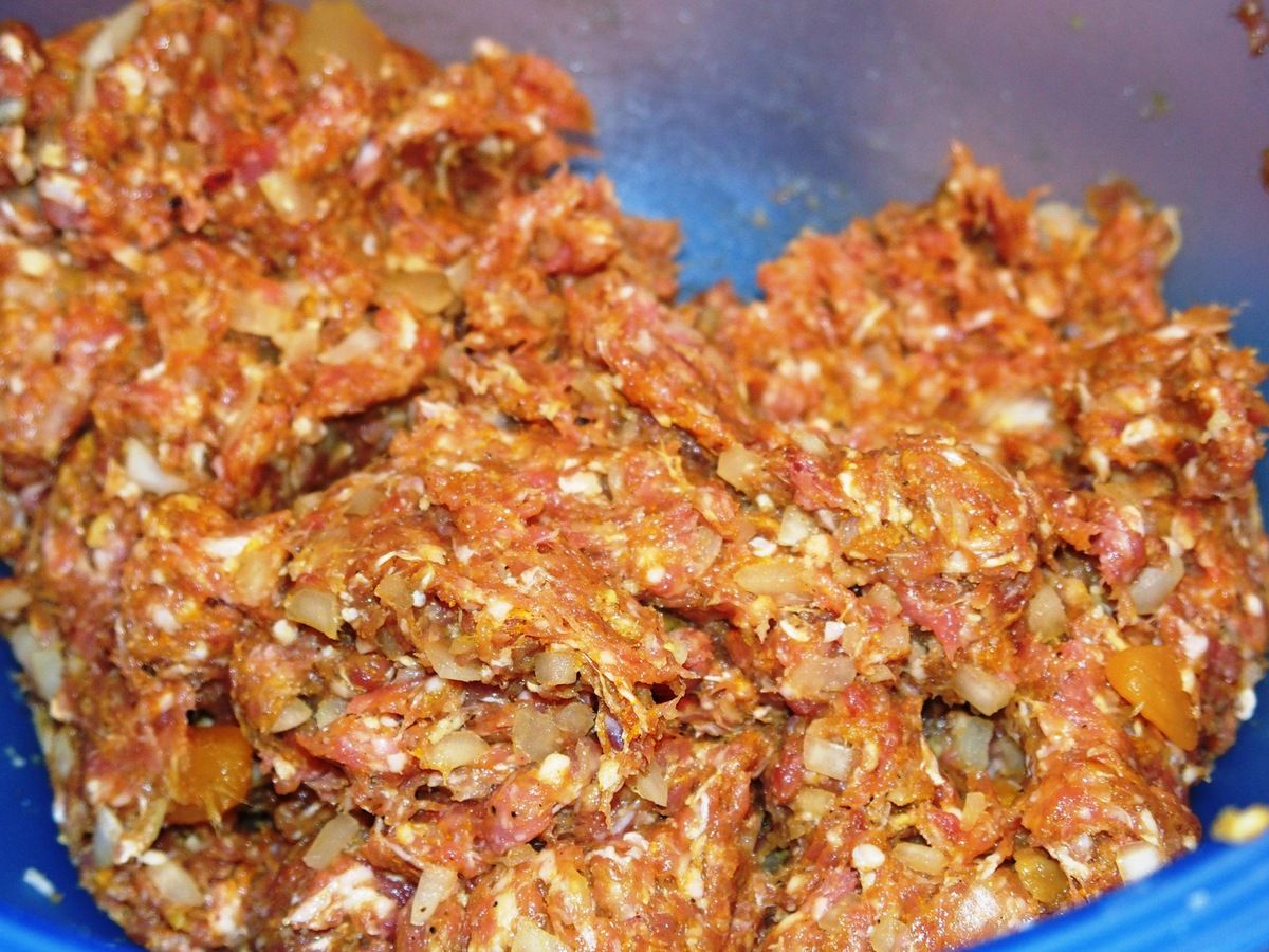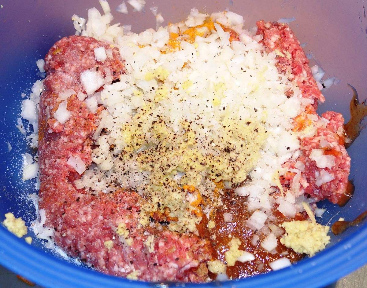 1) Dans un grand récipient, mettre la viande hachée et ajouter les épices: le curcuma, le garam masala, le piment de Cayenne, le cumin, la coriandre. Hacher l'oignon et presser l'ail avec le presse-ail et ajouter ainsi que 2 càs de chutney de mangue. Peler le gingembre et le râper à la râpe fine pour obtenir environ 2 càs. Mettre dans le récipient. Saler (2 càc) et poivrer. Bien mélanger le tout avec vos petits doigts.