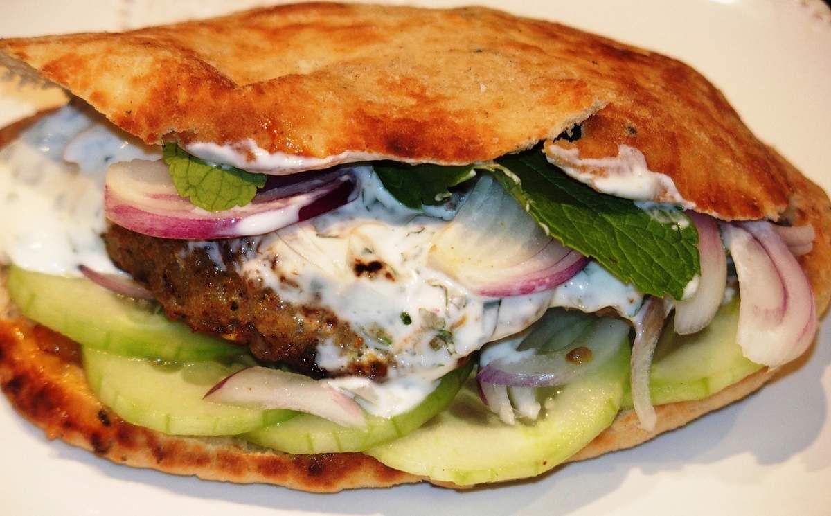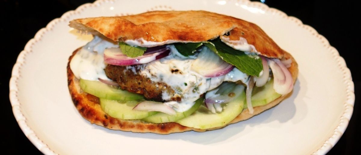 Des burgers d'agneau plein d'épices comme le curcuma, le coriandre, le gingembre, le garam masala, le cumin. Une pointe de chutney de mangue, de l'ail et le tour est joué. Du pain Naan, des oignons rouges, du concombre et une magnifique sauce raïta à la menthe.