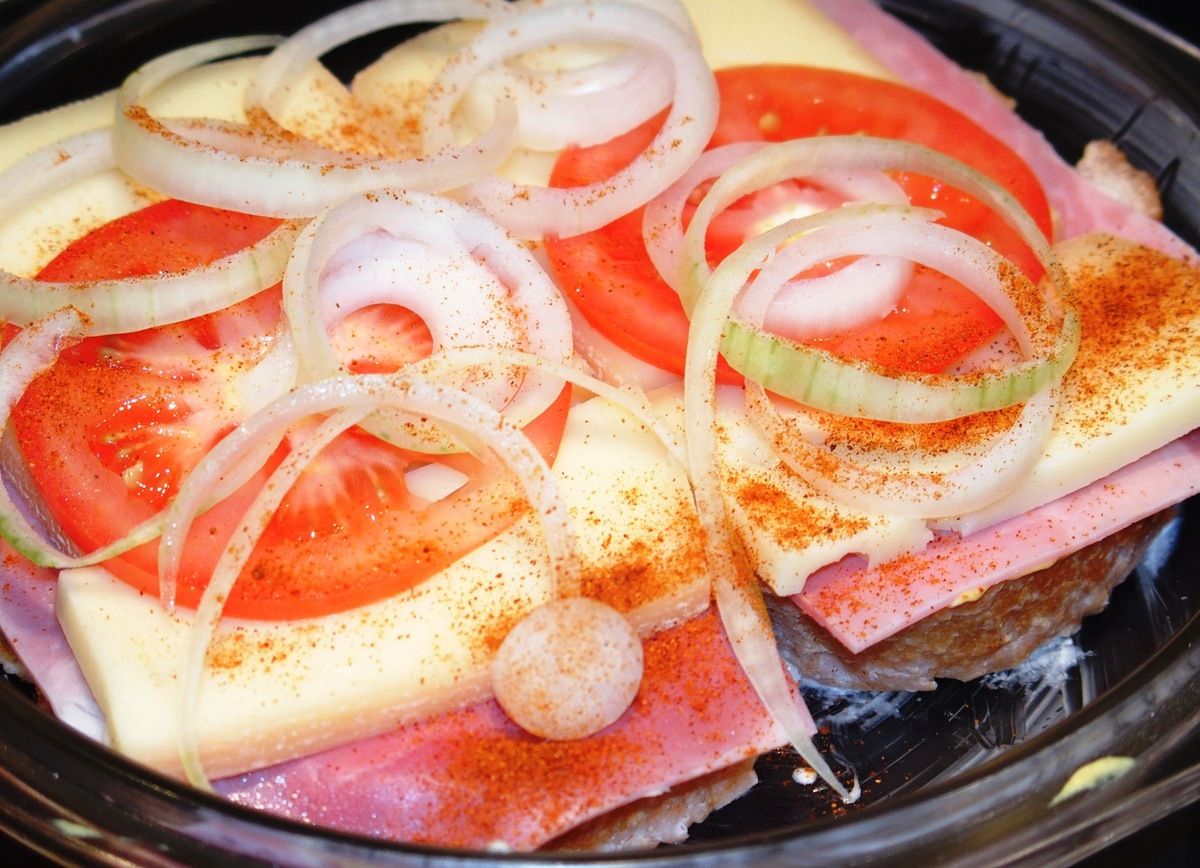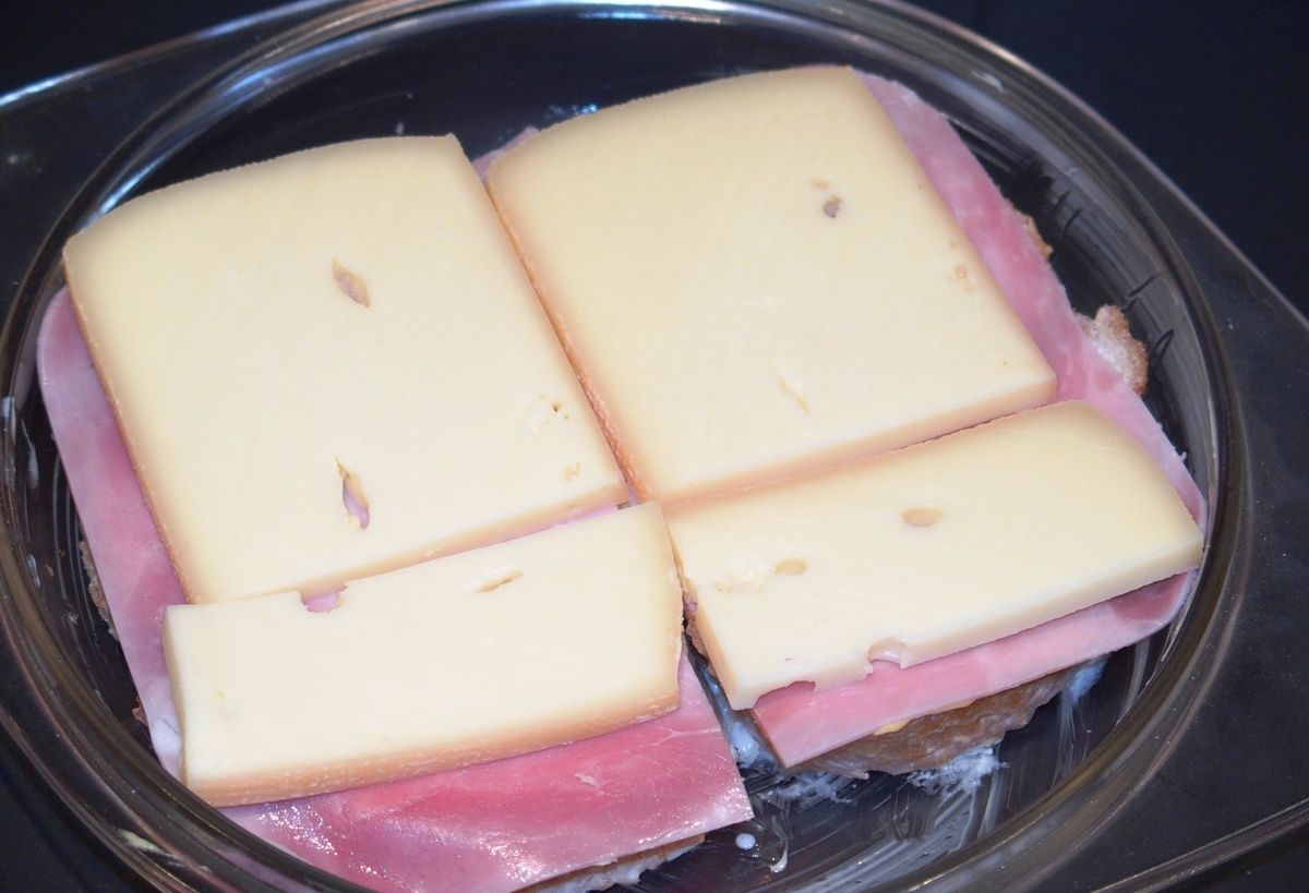 2) Découper les tranches de jambon en fonction des tranches de pain et poser dessus. Recouvrir avec les tranches de fromage à raclette (environ 3 par plat, voir photo ci-dessous).