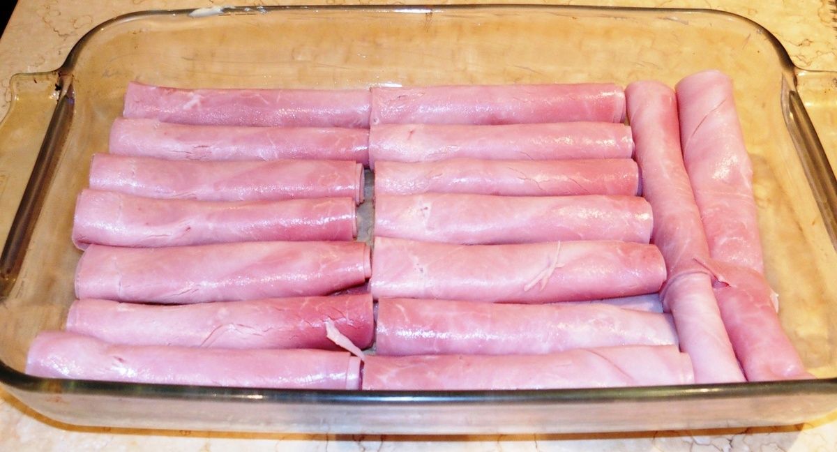 1) Préchauffer le four à 200°C. Beurrer un grand plat à gratin. Rouler les tranches de jambon dans la largeur et les disposer dans le plat sur tout le fond.