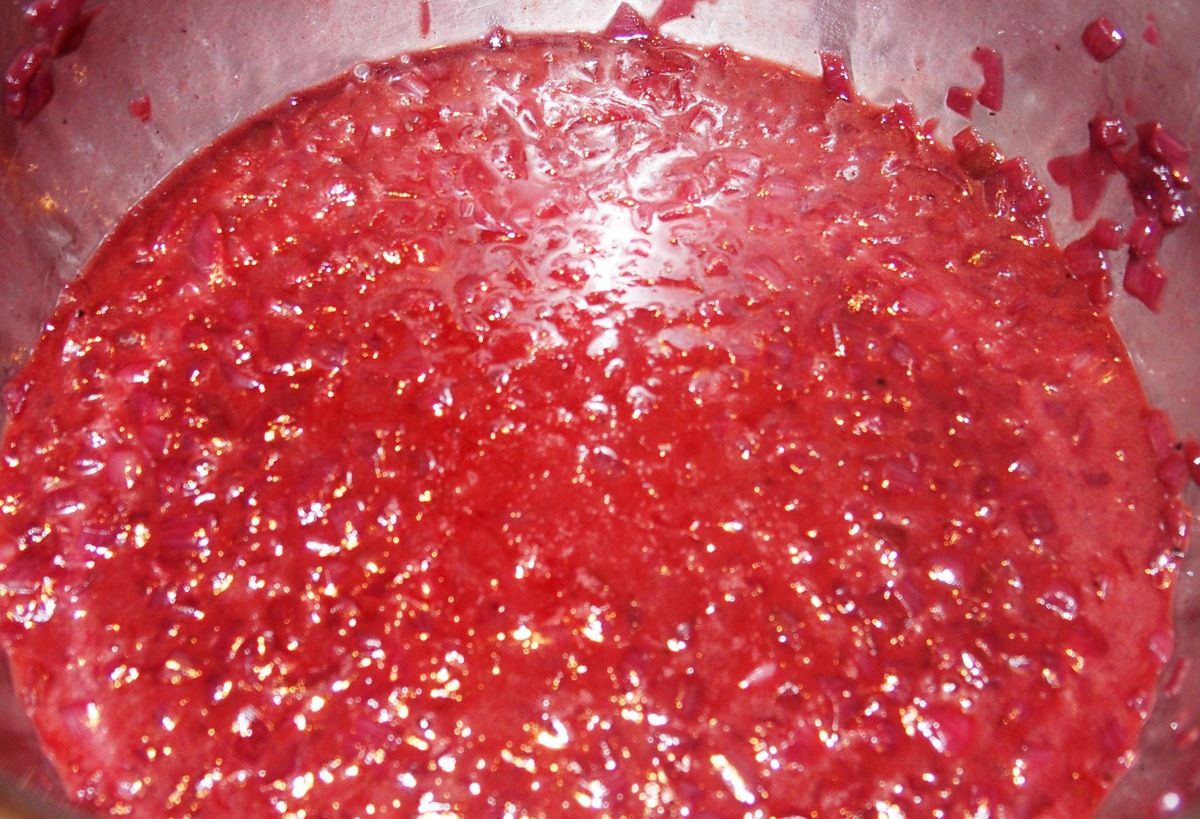 3) Ajouter le vin rouge, le fond de veau concentré et poivrer. Réduire le feu sur feu doux et laisser réduire la sauce à découvert environ 45 minutes. Il ne devrait en rester plus qu'un tiers environ et elle devrait être un peu sirupeuse.