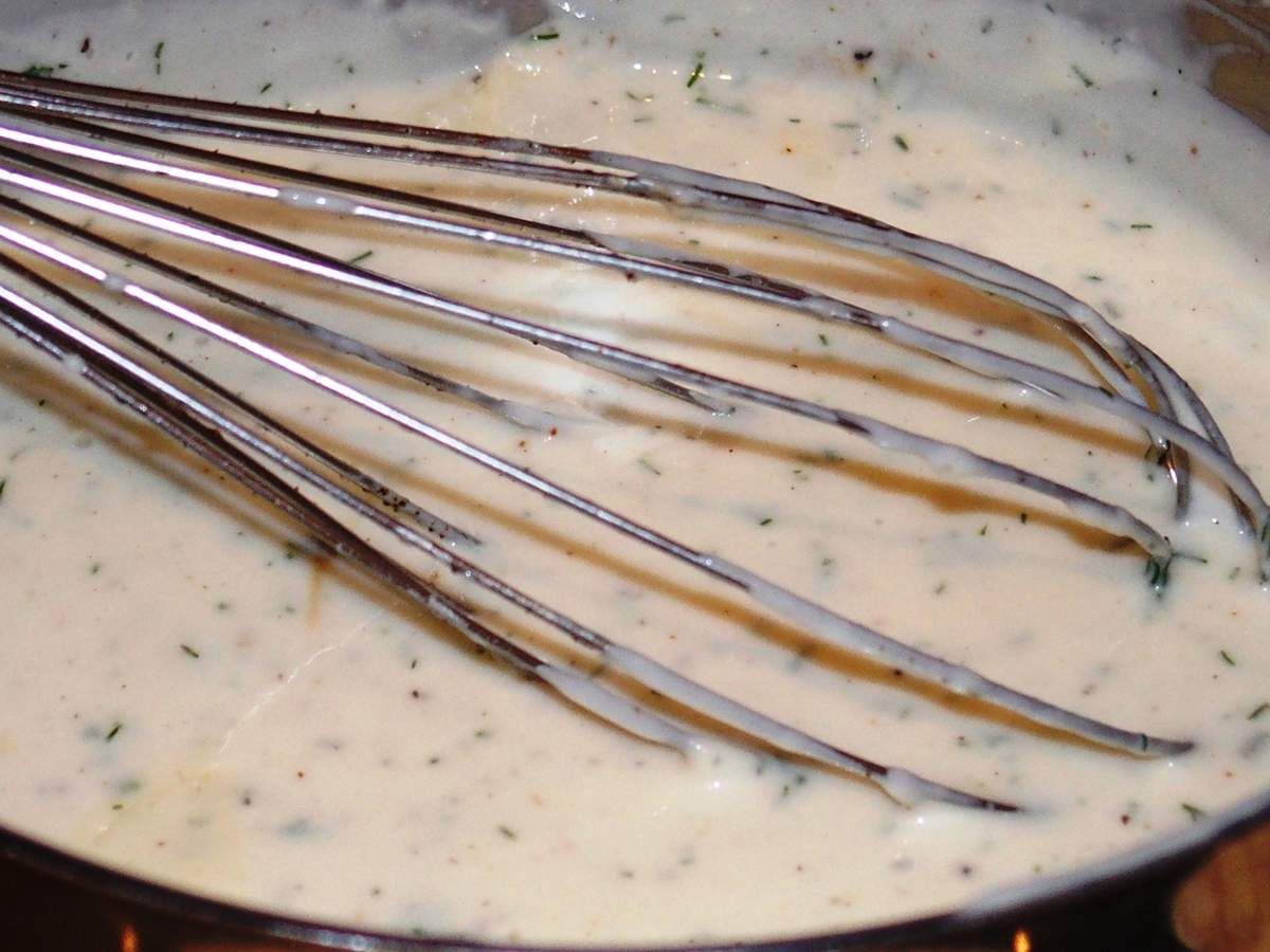 2) Préparer la béchamel: Faire fondre 50g de beurre dans une casserole à feu moyen, ajouter 50g de farine et mélanger avec une spatule. Retirer la casserole du feu et verser en une fois le lait et la crème. Fouetter vigoureusement jusqu'à disparition des grumeaux. Remettre sur feu moyen. Assaisonner de noix de muscade râpée, sel et poivre. Ajouter le bouillon réservé. Laisser cuire ainsi sur feu doux après l'ébullition en fouettant régulièrement durant environ 10 minutes jusqu'à ce que la sauce épaississe. Goûter et rectifier l'assaisonnement. Ajouter l'aneth ciselé. Couper le feu et laisser tiédir.