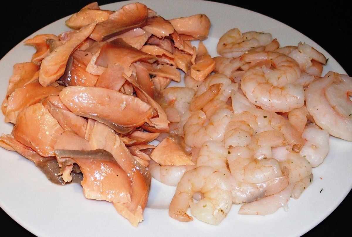 3) Prendre le saumon (ôter la peau) et le détacher en lanières (effilocher grossièrement). Couper les queues de crevettes en deux dans l'épaisseur (donc sur la longueur). Vous pouvez les laisser entières mais coupées en deux, elles seront plus adéquates pour faire une couche de lasagne régulière et pas trop "bombée). Réserver dans une assiette.
