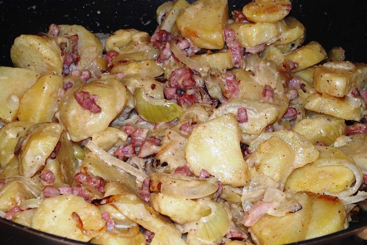 4) Dans une grande poêle, mettre à chauffer un tout petit peu d'huile à rôtir et faire revenir lardons, oignons et ail à feu moyen durant 5 minutes. Ajouter les rondelles de pommes-de-terre. Poivrer et saler un peu. Saupoudrer d'une bonne pincée de muscade en poudre. Laisser cuire ainsi en mélangeant durant environ 5 minutes. Préchauffer le four à 200°C. Beurrer un plat à gratin.