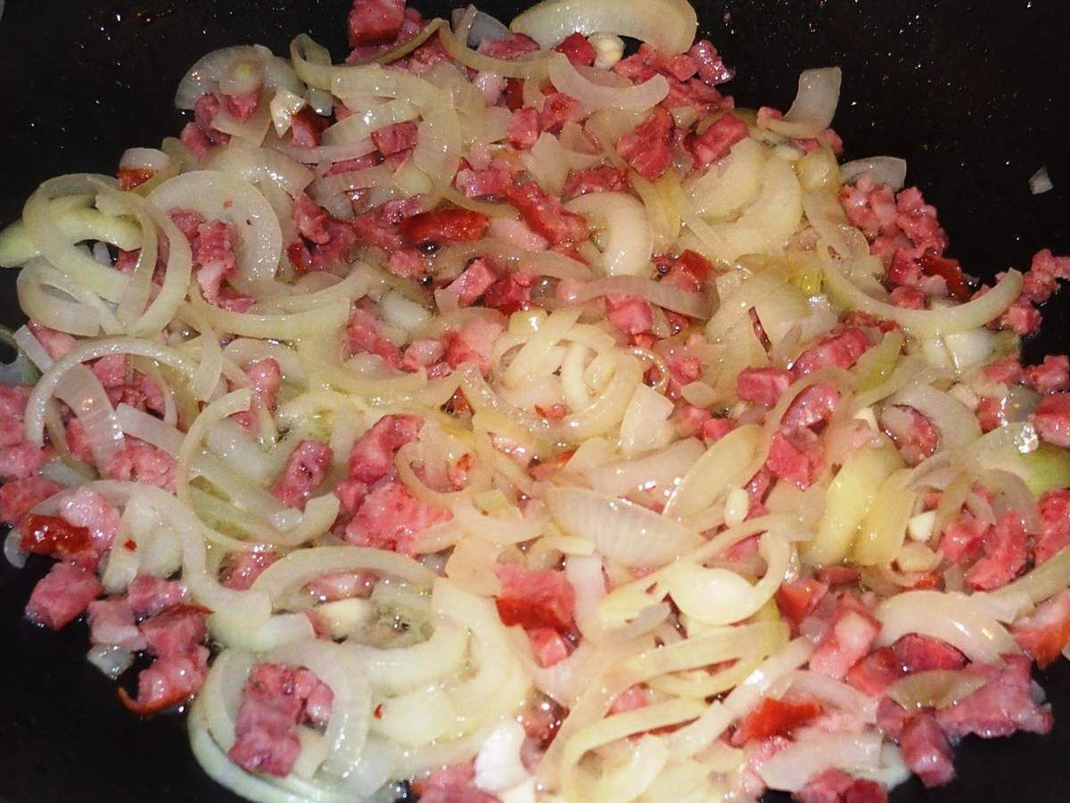 2) Pendant ce temps, peler les oignons, les couper en deux et les émincer en rondelles fines. Réserver. Hacher la gousse d'ail et mettre avec l'oignon.