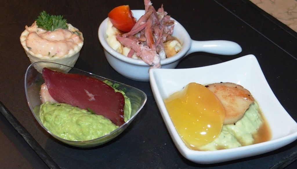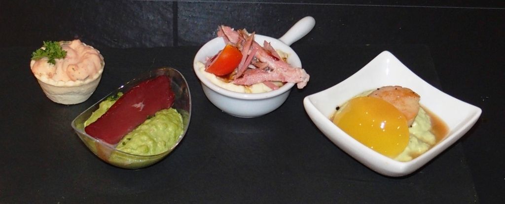 Je vous propose aujourd'hui de délicieux petits amuse-bouches pour vos fêtes de fin d'année. Pour vous donner des idées. Des tartelettes de cocktail de crevettes, des noix de St-Jacques sur une purée d'avocat et sa gelée d'agrumes, des magrets de canard fumés sur purée de petits pois et une purée de panais et jambon. Simples à préparer, ils feront tout leur petit effet. Et puis c'est mieux que des chips ou des cacahuètes non?