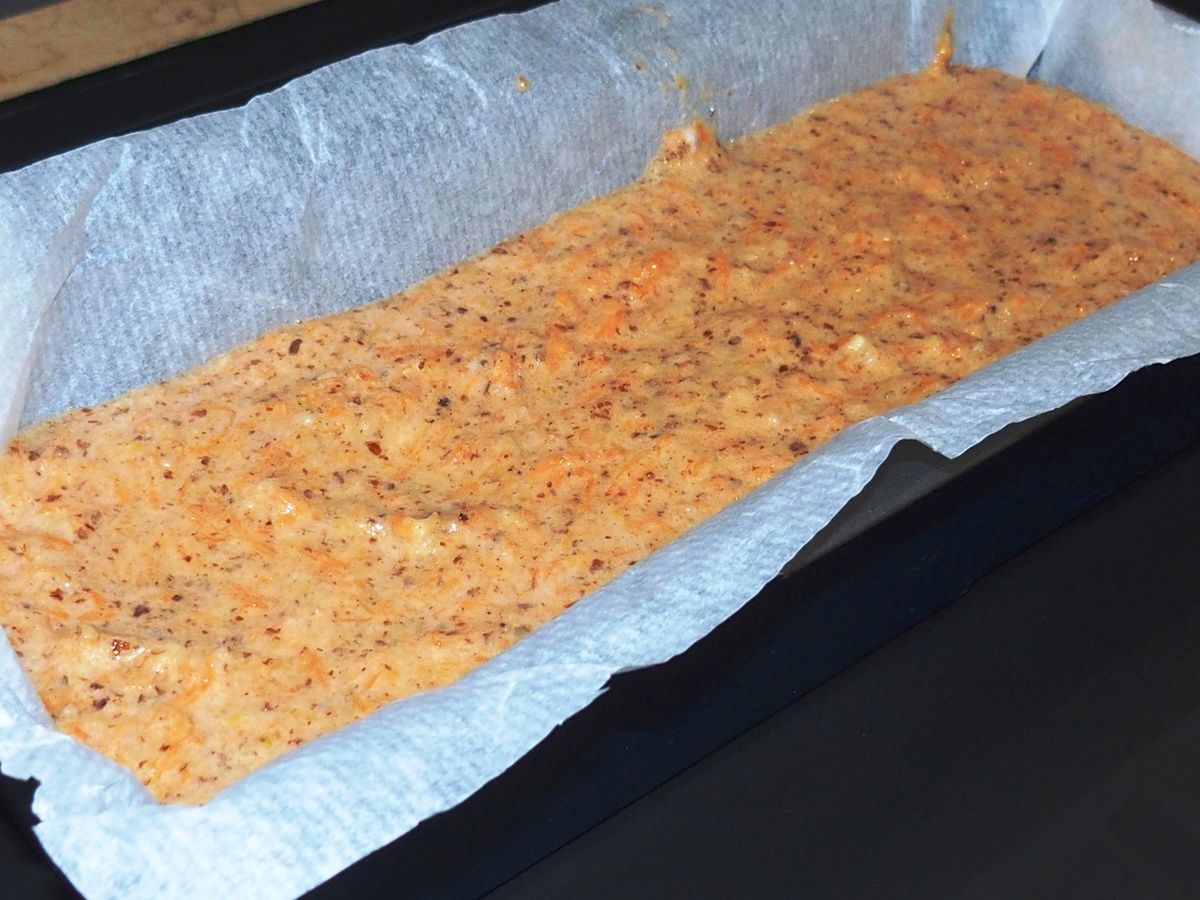 5) Beurrer et fariner le moule à cake ou le recouvrir de papier sulfurisé. Verser l'appareil.