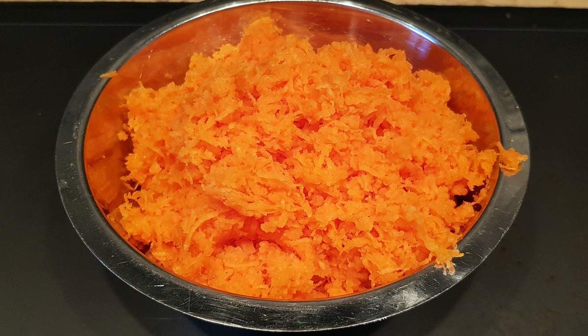 2) Peler et râper les carottes finement jusqu'à obtenir 300g (à l'aide d'un robot ménager par exemple). Ajouter les carottes dans le mélange jaunes d'oeufs et sucre. Mélanger avec une spatule. Ajouter la poudre d'amandes. Mélanger. Râper le zeste du demi-citron et presser le jus. Ajouter et mélanger.