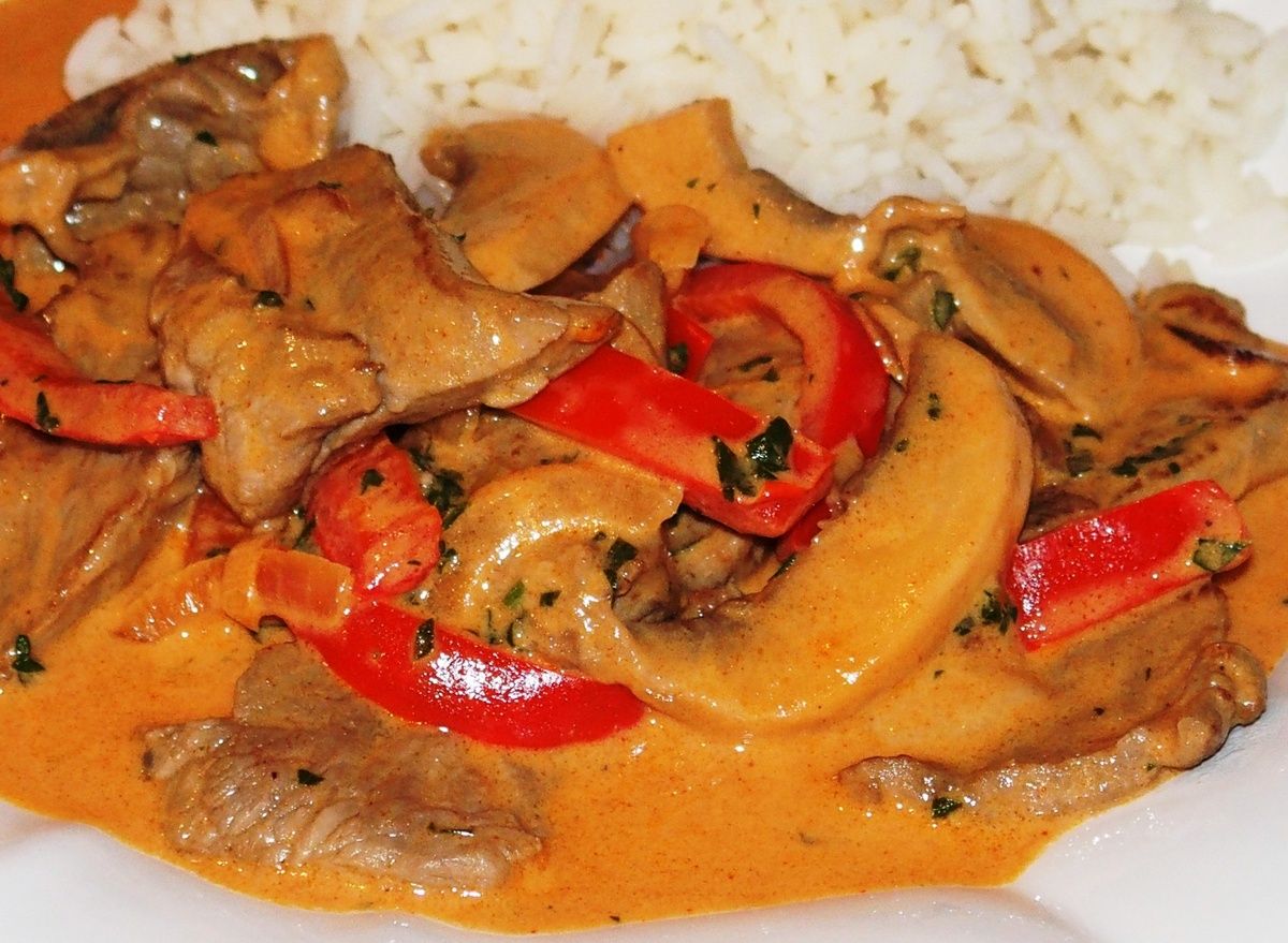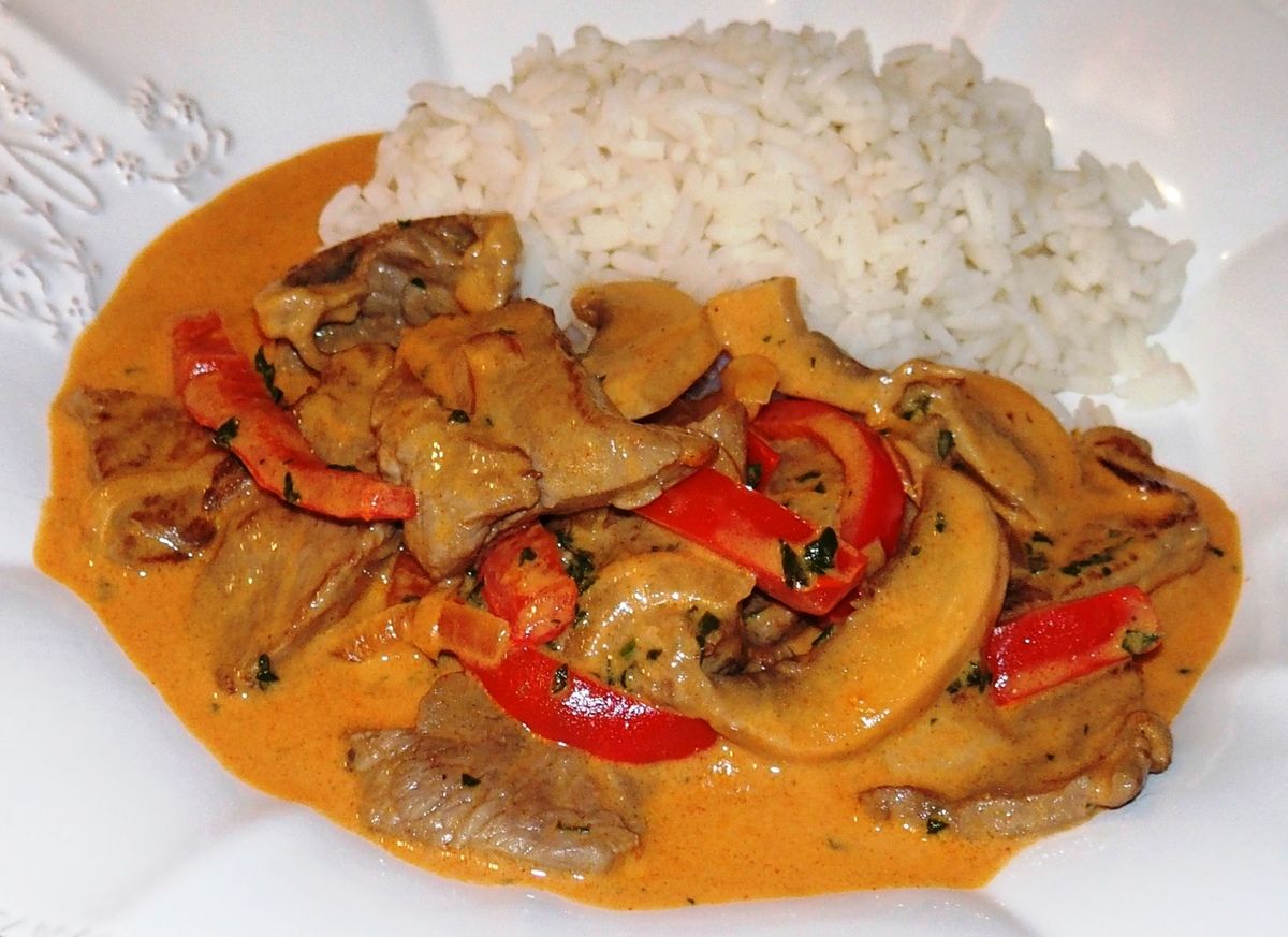 Bravo. Aucun cuisinier pro ne propose une recette de la sorte. C'est délicieux. A se relever la nuit. Bocuse n'en parle pas et Ducasse nous prive de poivrons, ce qui change tout. Le poivron donne de la couleur au plat. Il évoque l'exotisme des contrées lointaine. Il est rouge comme le fut un temps le drapeau du pays du Général Stroganov. Il est mexicain, mais aurait aussi bien pu provenir d'Odessa, pays natal du bœuf stroganoff (M. Dupont, cuisinier fançais de l'armée impériale russe). Il donne un parfum incomparable, allégeant se plat crémeux. On utilisera d'ailleurs de la crème légère. Comble du bonheur, ce plat se conserve très bien en bocal hermétique au frigo, sans changer de goût. Un plat que l'on peut donc préparer à l'avance, jusqu'à trois jours avant, lorsqu'on a autres choses à faire en cuisine au moment du coup de feu. Minuscule observation : il est plus prudent de rectifier l'assaisonnement après avoir remis la viande dans la sauce. Car vous avez assaisonné la viande séparément et après cuisson. Il est d'ailleurs bon de verser dans la sauce, en cours de cuisson, le jus produit par la viande au repos. Et n'oublions pas de faire la vaisselle de la cuisine au fur et à mesure de l'élaboration du plat. ça donne le sourire lorsque l'on revient à la cuisine à la fin du repas. Bon appétit et large soif, comme disait l'ami Paul. Cordialement PdBdC