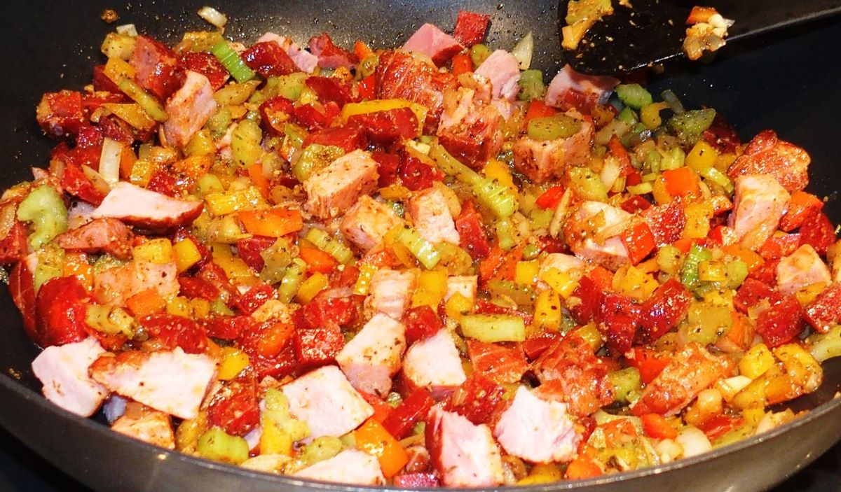 7) Ajouter le chorizo et le jambon et laisser cuire 5 minutes, toujours sur feu moyen, en mélangeant.