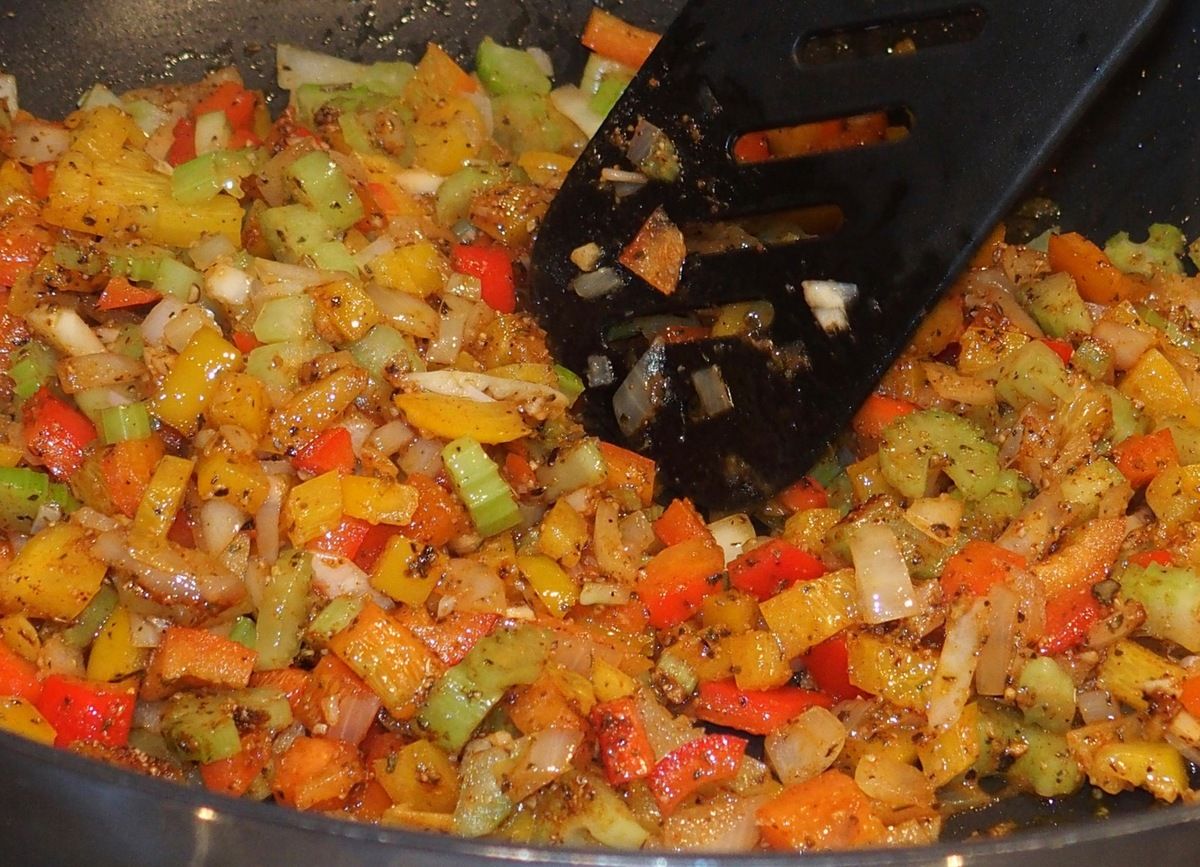 6) Dans une grande poêle, mettre à chauffer un filet d'huile d'olive. Sur feu moyen, faire revenir oignon, ail et céleri 2 minutes puis ajouter les poivrons et cuire encore 3 minutes. Ajouter le mélange d'épices et la feuille de laurier. Bien mélanger.