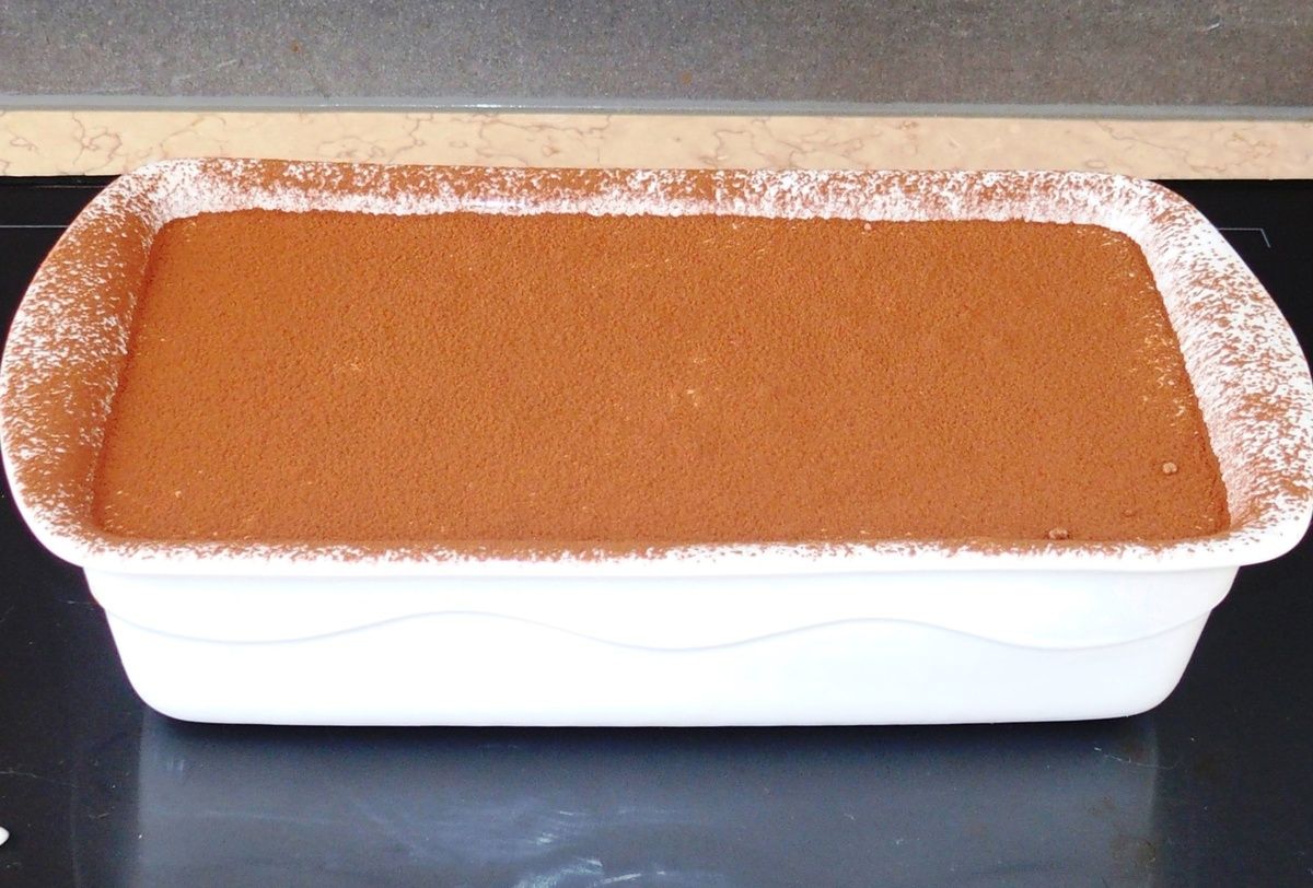 3) Dans l'assiette du café froid, ajouter le ou les alcools et mélanger. Tremper la moitié des pèlerines une à une brièvement des deux côtés dans l'assiette et les disposer côte à côte dans le plat en les serrant bien. Recouvrir d'une couche de crème. Faire une deuxième couche de pèlerines, puis recouvrir de la deuxième moitié de crème. Saupoudrer de cacao. Recouvrir de papier film et mettre au réfrigérateur pour au moins 8 à 12 heures ou la veille.