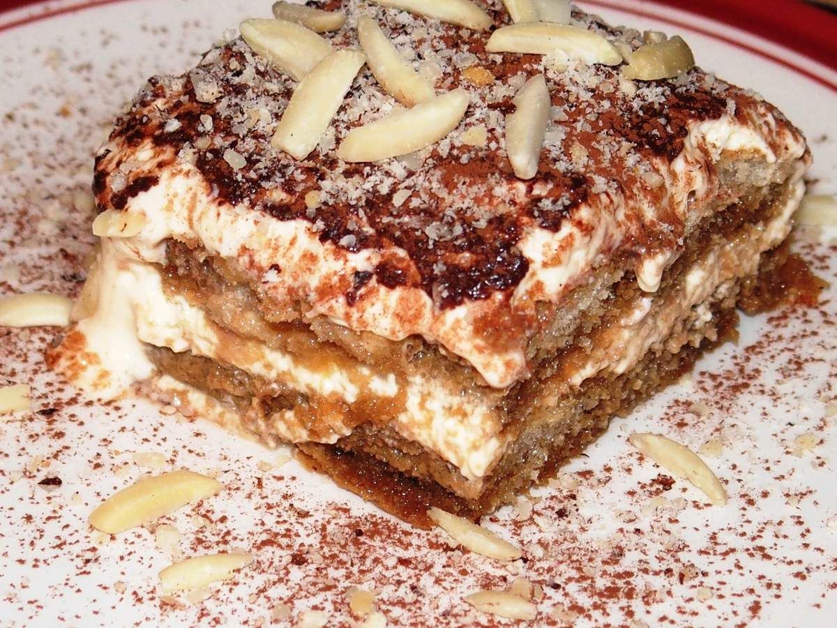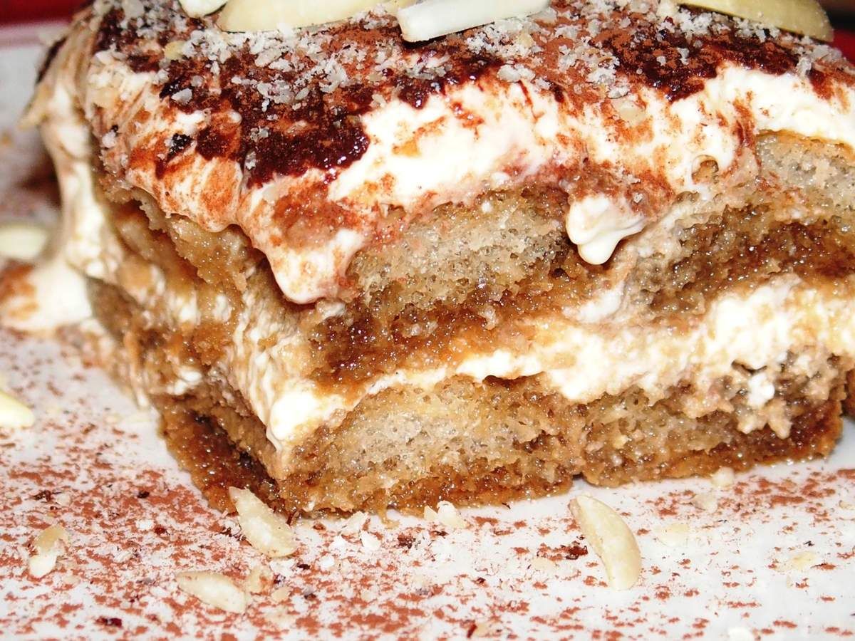 4) Découper de belles portions de tiramisu. Saupoudrer d'un peu de cacao, de noisettes moulues et d'amandes allumettes. Servir.