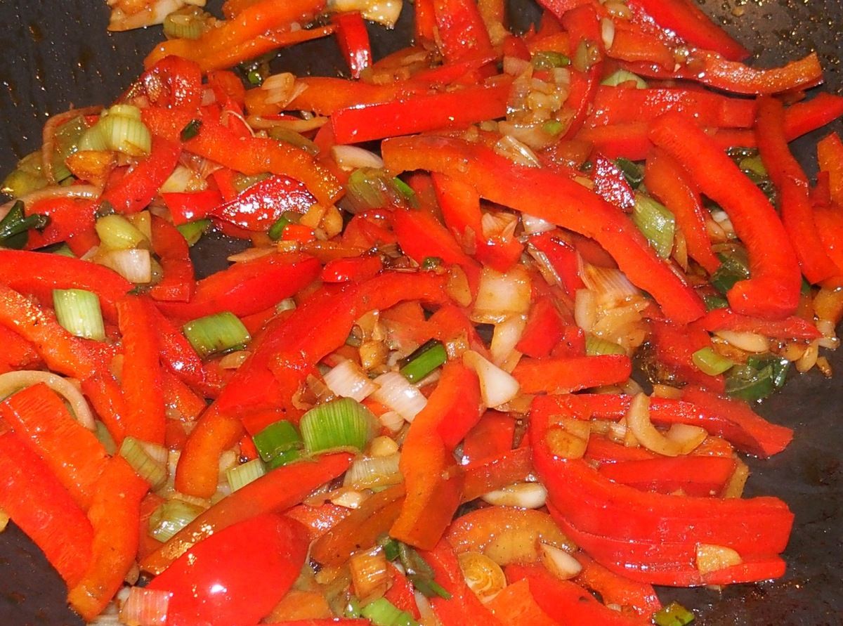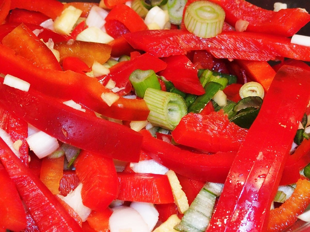 1) Couper le poulet en cubes d'environ 2 à 3 cm. Réserver dans un récipient. Mettre tous les ingrédients suivants ensemble dans un autre récipient: couper le poivron en deux dans la longueur, retirer le centre et le découper en lanières. Retirer environ 5 cm des feuilles de l'oignon de printemps puis le découper en fines rouelles. Mettre avec le poivron. Couper la gousse d'ail en petits morceaux. Peler le gingembre et l'émincer finement. Couper le petit piment rouge en deux dans la longueur, retirer les graines avec un petit couteau et émincer finement. Réserver.