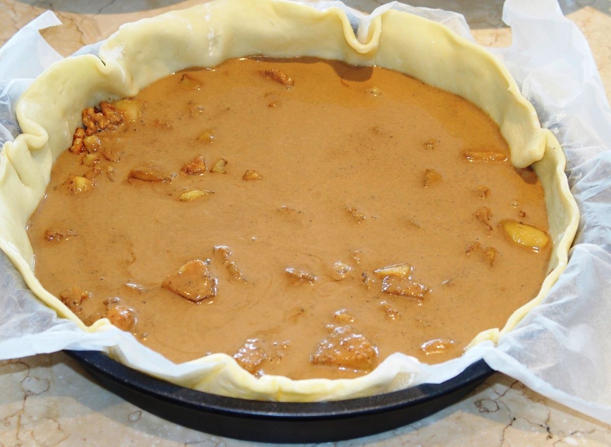 4) Beurrer et fariner la plaque à gâteau ou mettre la pâte avec le papier sulfurisé dans la plaque. Bien faire remonter les bords en appuyant sur tout le tour de la plaque. Piquer le fond avec une fourchette. Saupoudrer le fond d'une bonne càs de farine. Mettre les pommes et les cerneaux de noix. Aouter la liaison au nillon délicatement.