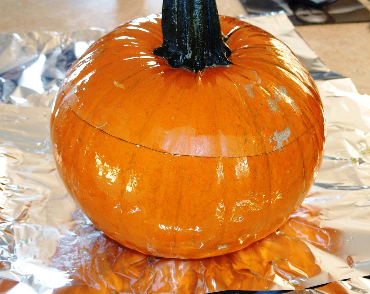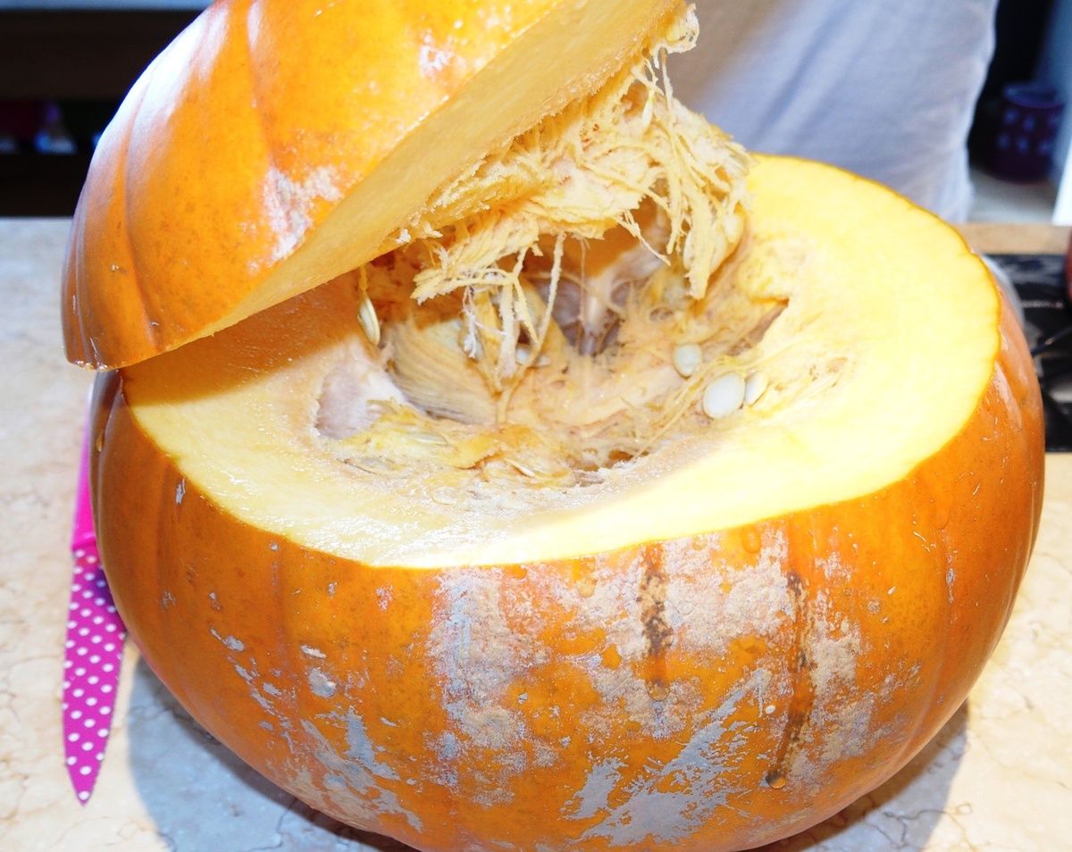 1) Laver la courge entière sous l'eau froide. Avec un bon couteau, découper un chapeau en tournant la courge petit à petit.