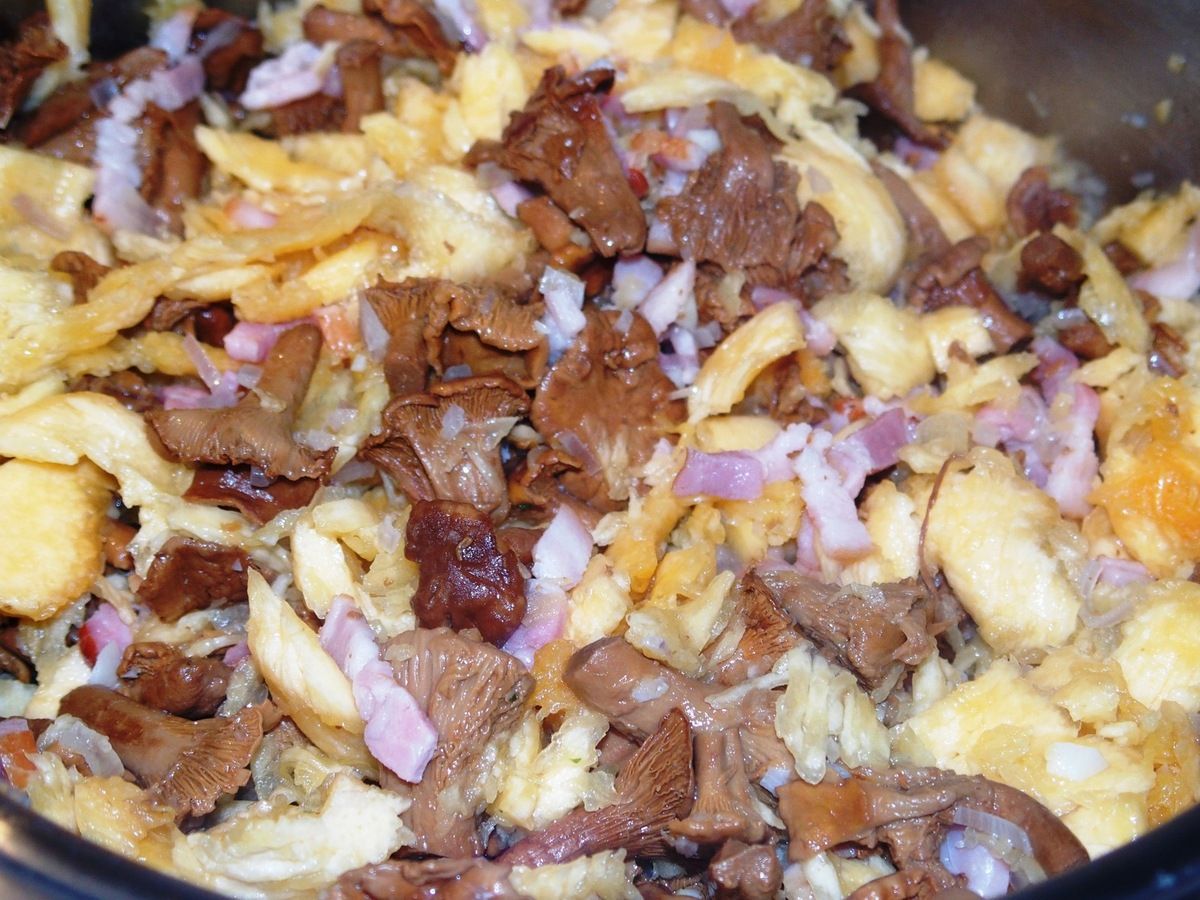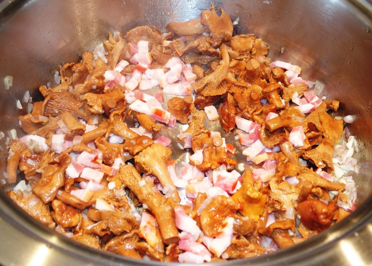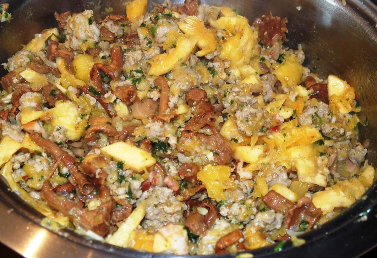 4) Dans une grande poêle ou une casserole, faire chauffer 2 càs d'huile d'olive. Ajouter les échalotes et l'ail. Faire suer 1 minute à feu moyen. Ajouter les chanterelles et les lardons. Ajouter les morceaux de courge. Poivrer et faire revenir 5 minutes. Puis ajouter la saucisse en morceaux. Ne pas hésiter à la casser avec une spatule. Bien mélanger. Ajouter deux bonnes pincées de cumin, coriandre et curry. Cuire ainsi environ 15 minutes en mélangeant régulièrement. Ajouter le persil haché et les marrons. Cuire encore 2 minutes. Goûter et rectifier l'assaisonnement en sel éventuellement. Sortir du feu et laisser tiédir.