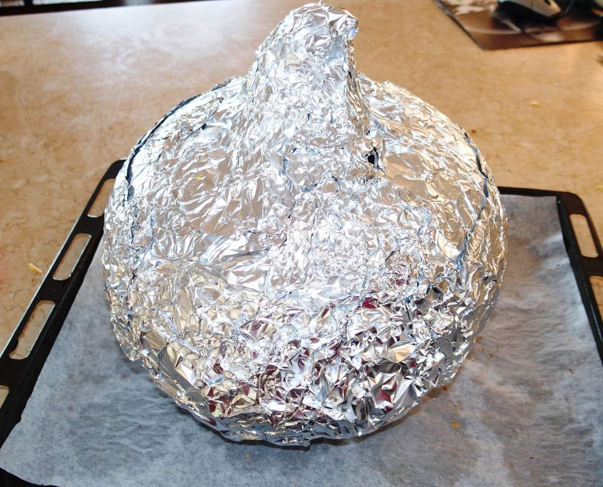 6) Préchauffer le four à 220°C. Sur une plaque, déposer de grandes feuilles d'aluminium pour pouvoir recouvrir la courge, en large et en long. Poser la courge. La huiler avec de l'huile d'olive de toutes parts. Huiler aussi l'intérieur et saler sur les bords et le fond. Farcir la courge avec la farce. Refermer avec le chapeau. Emballer la courge soigneusement. Enfourner dans le bas du four.