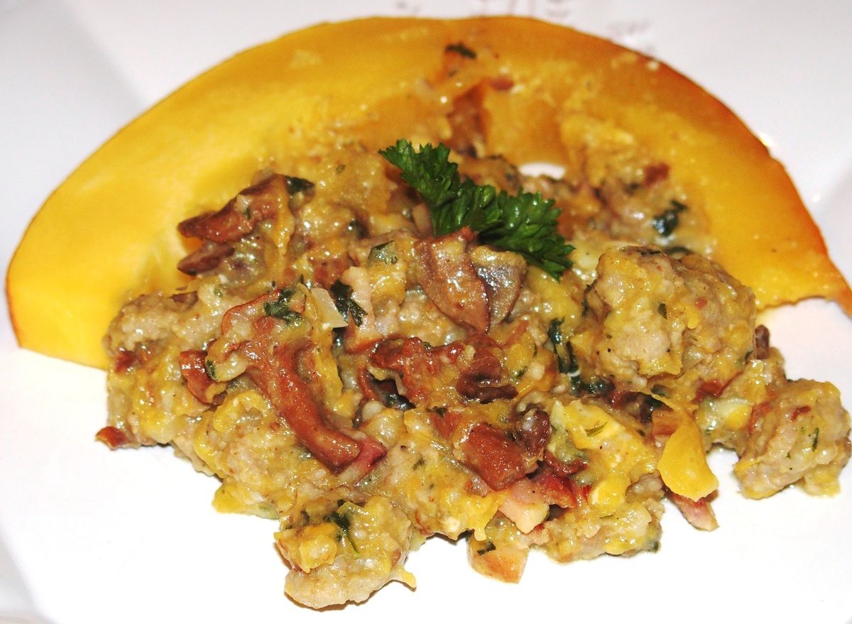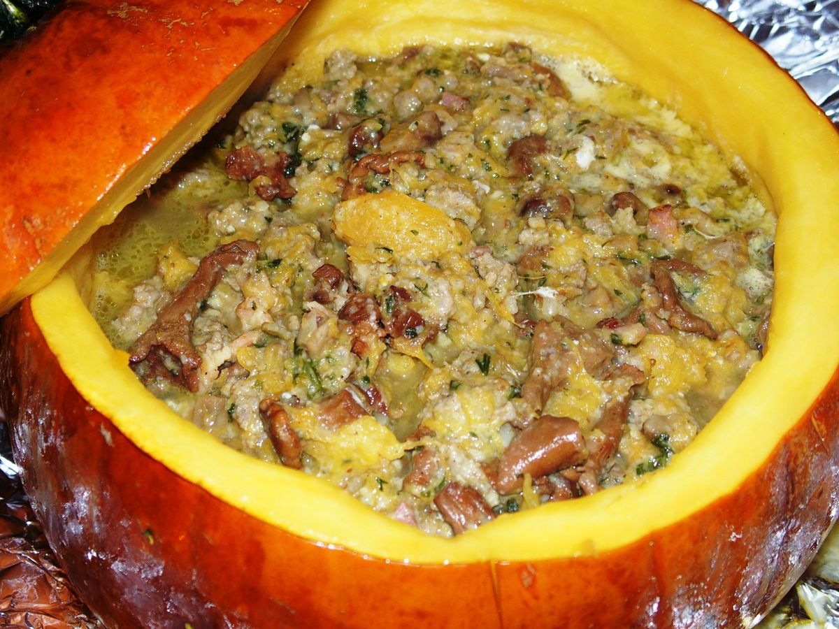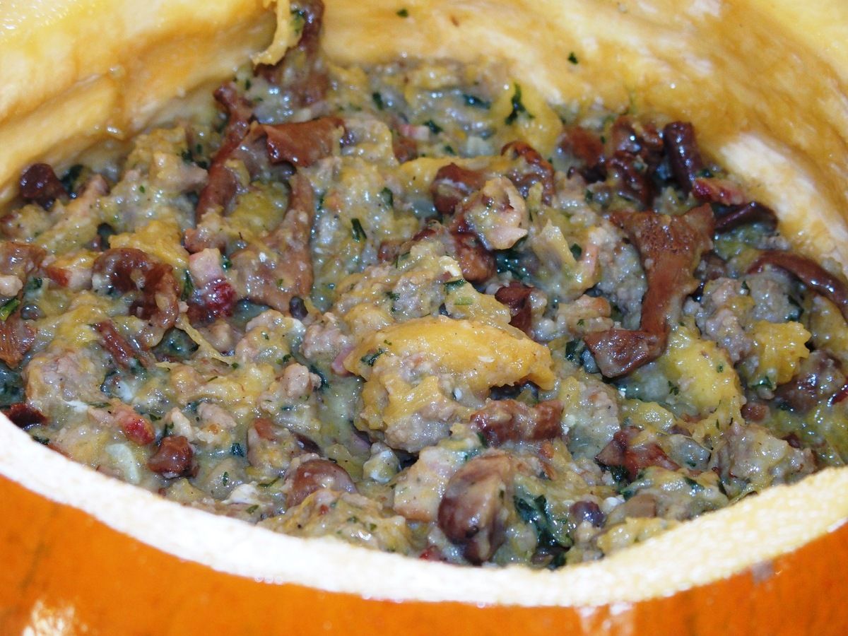 Une courge entière évidée puis cuite au four dans de l'aluminium. Une farce à tomber composée de chair à saucisse, de marrons cuits, de chanterelles, de lardons et j'en passe. Un délice.