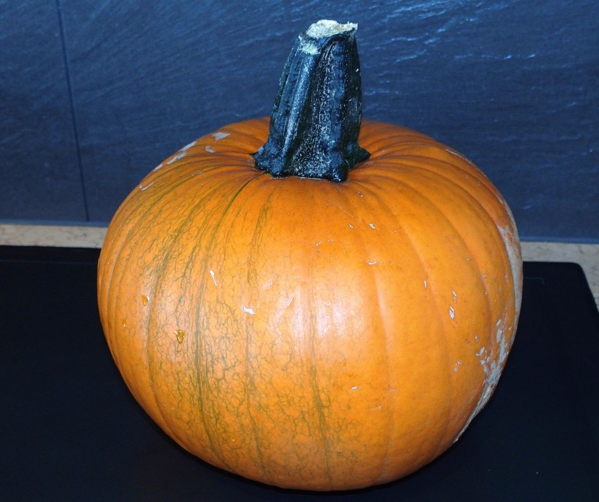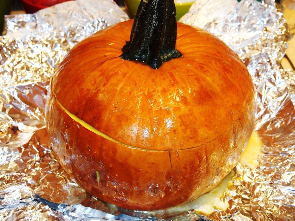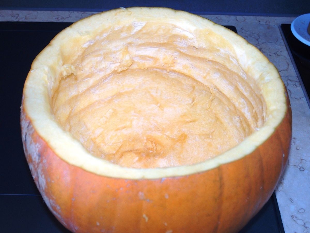 Choisissez une courge bien ronde et régulière, comme celles qu'on utilise à Halloween. J'avais pris une courge d'environ 5 kg mais c'était un peu trop gros par rapport à la quantité de la farce. Prenez-en une de 3,5 à 4 kilos. Vous pourrez nourrir sans problème 6 personnes au moins!