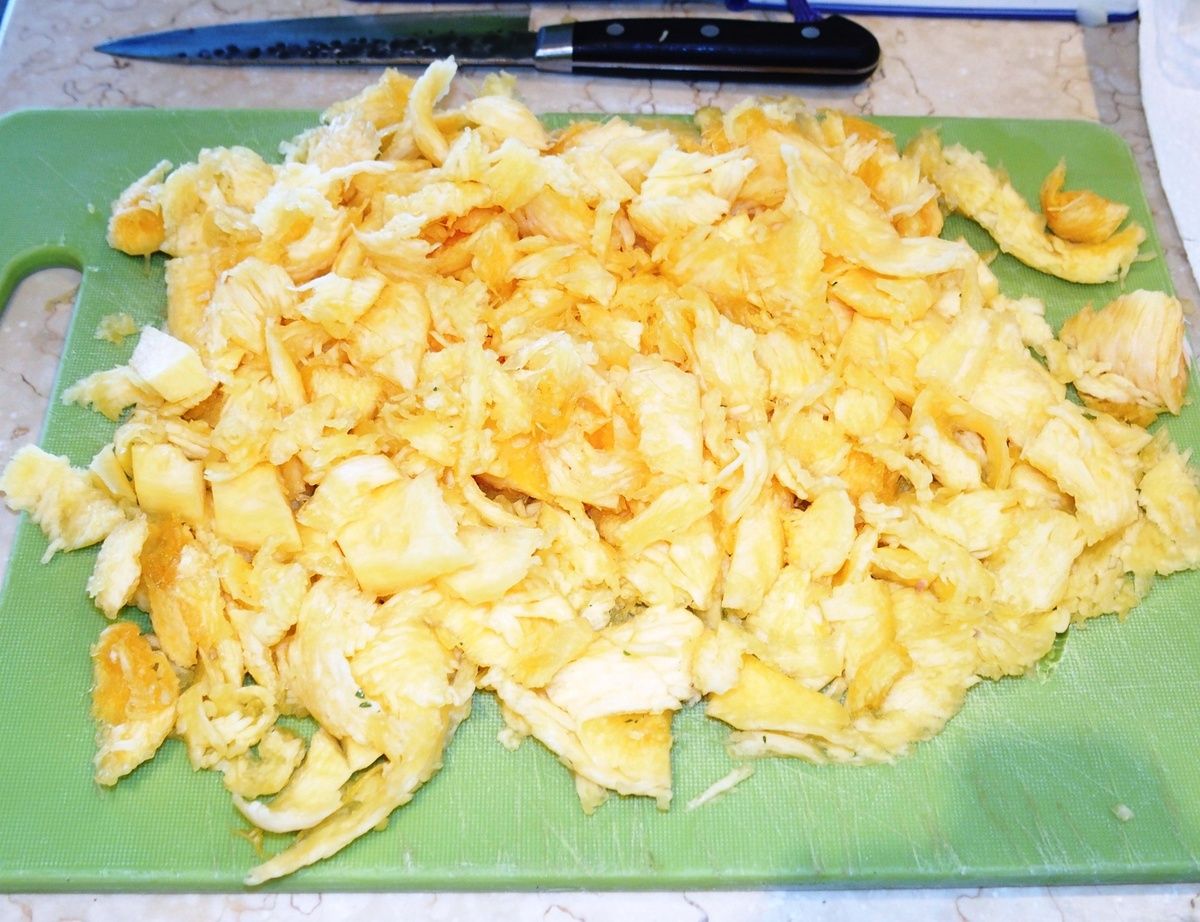 2) Avec une cuillère, évider la courge. Jeter le centre avec les pépins et les filaments. Puis, toujours avec la cuillère, creuser les bords et les fonds pour retirer la chair et la mettre dans un récipient. Le but étant de laisser environ 1,5 cm d'épaisseur de courge sur les bords et le fond. Vous obtiendrez environ 800g de chair. Découper cette chair en morceaux et réserver pour l'ajouter ultérieurement à la farce.