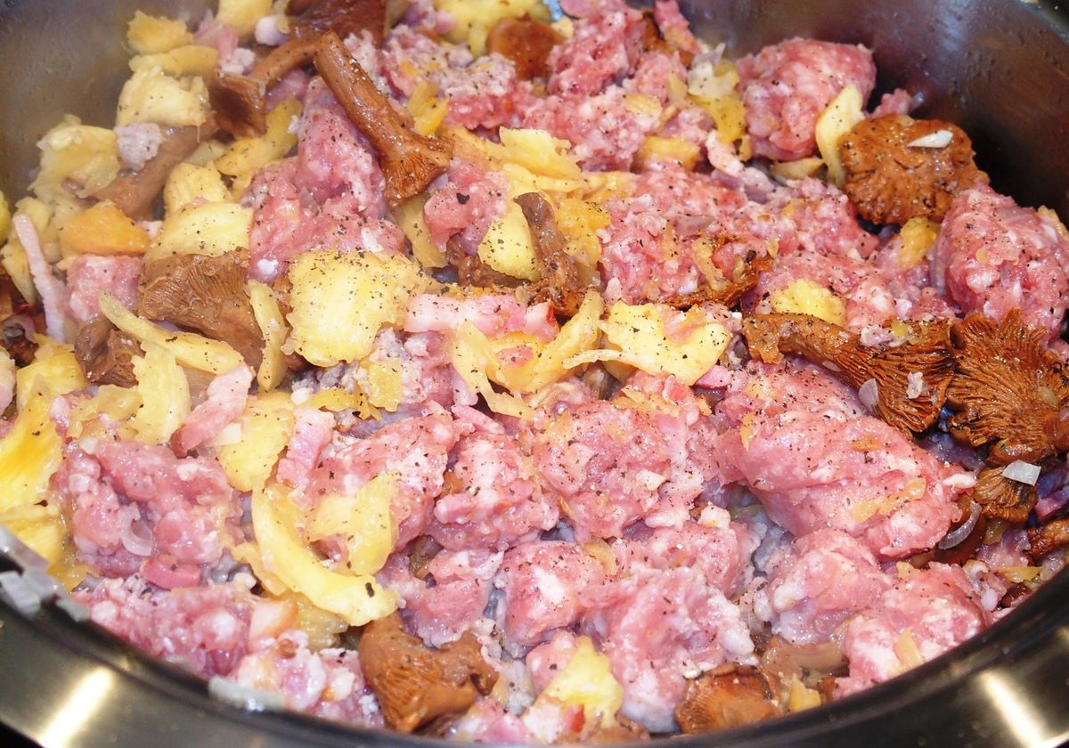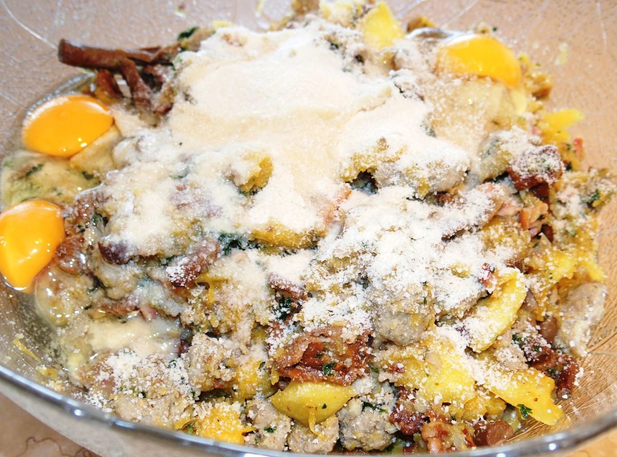 5) Ajouter les oeufs et la chapelure dans la farce tiède et bien mélanger.