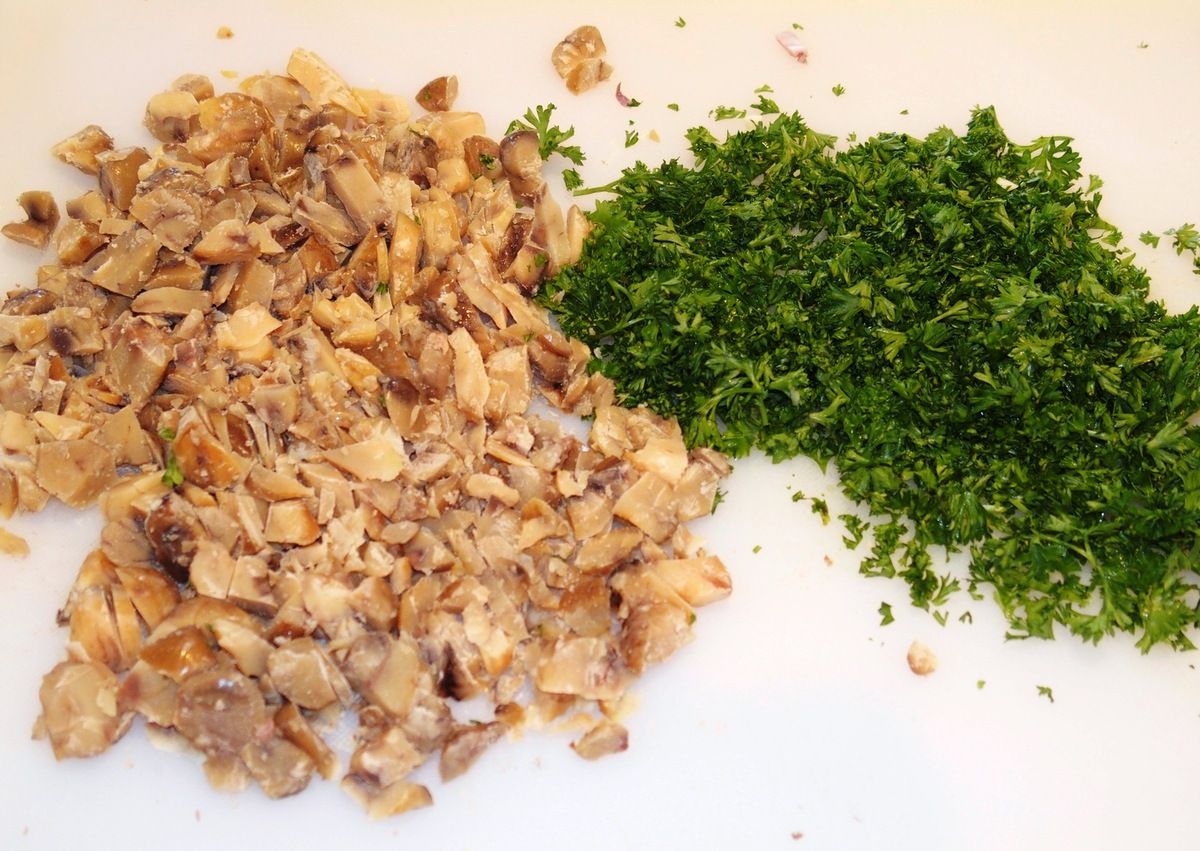 3) Hacher les échalotes et l'ail et réserver dans un bol. Nettoyer ou égoutter les chanterelles et réserver. Enlever la peau de la saucisse à rôtir et la déstructurer. Réserver. Hacher le persil. Couper les marrons en petits morceaux.