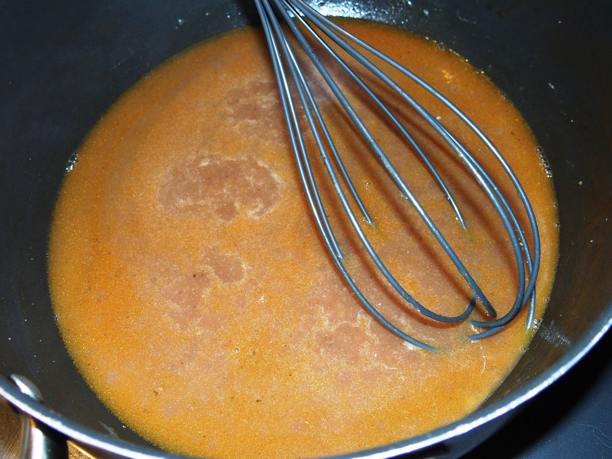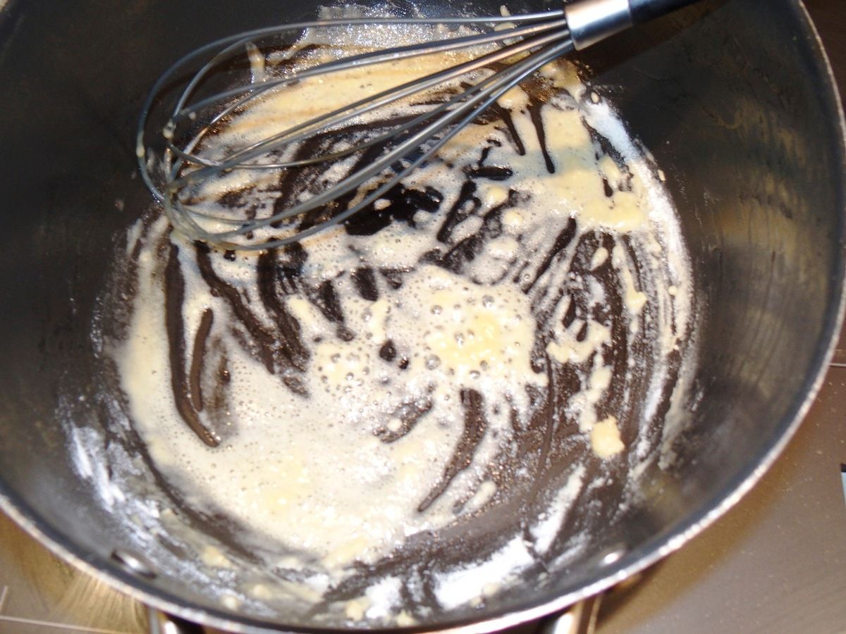 4) Après deux heures de cuisson, sortir le rôti et le laisser reposer, emballé dans du papier aluminium, durant 10 minutes. Pendant ce temps, retirer les légumes de la cocotte. Ils servent surtout à donner du goût à la sauce. Vous pouvez les conserver pour les manger avec le rôti, mais moi je préfère faire des légumes al dente à côté :-) Filtrer le jus de la sauce à travers un chinois ou une petite passoire et mettre dans un récipient. Dans la cocotte, faire fondre une bonne càc de beurre à feu moyen puis ajouter 1 bonne càc de farine et mélanger avec un fouet. Ajouter le jus réservé (environ 5dl) et laisser cuire à frémissements 5 minutes, le temps que la sauce réduise et épaississe.
