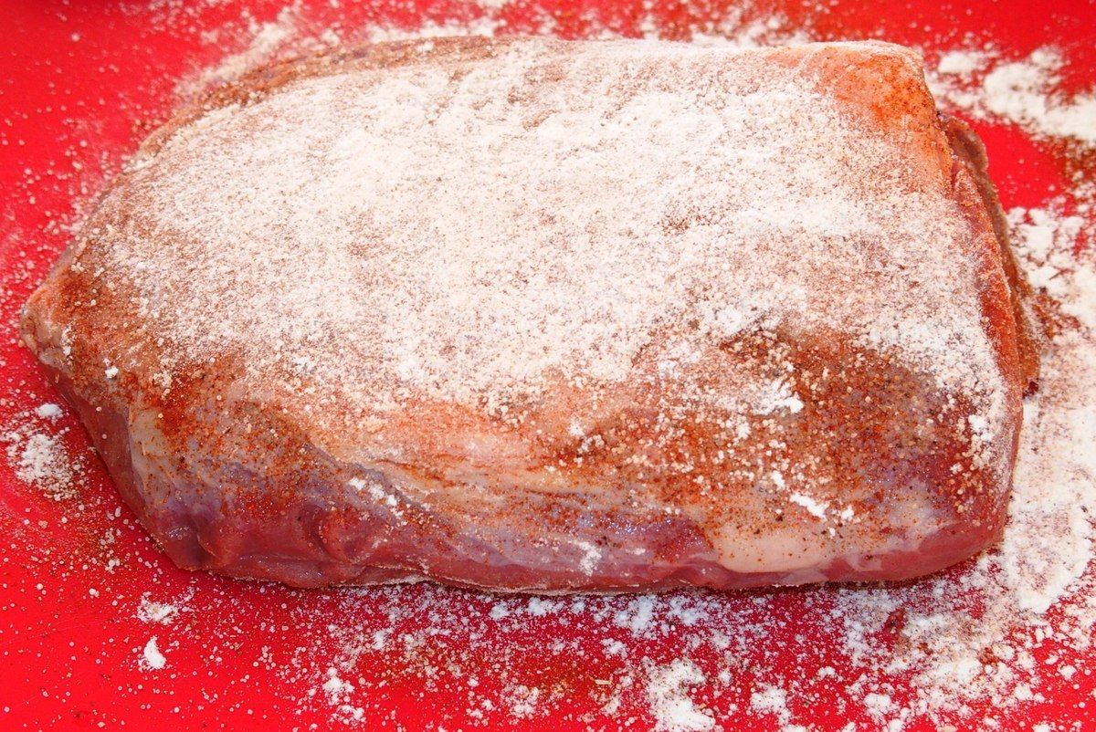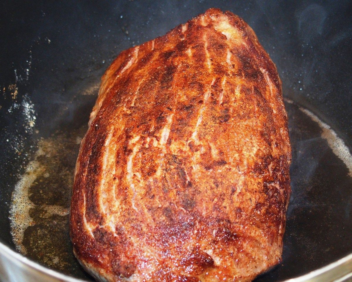2) Piquer le rôti avec les gousses d'ail (si vous le souhaitez). Poivrer, saler et saupoudrer de paprika et de farine le rôti de toutes parts. Dans une grande cocotte, mettre à chauffer de l'huile et faire revenir le rôti sur feu vif. Dès qu'une croûte s'est formée (après 3-4 minutes), tourner le rôti sur l'autre face. Durant environ 6 à 7 minutes en tout pour les deux faces. Retirer le rôti de la cocotte et le mettre sur une assiette. Essuyer le gras de la cocotte avec du papier ménage.