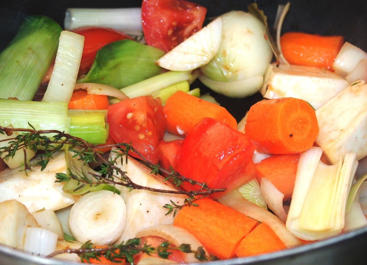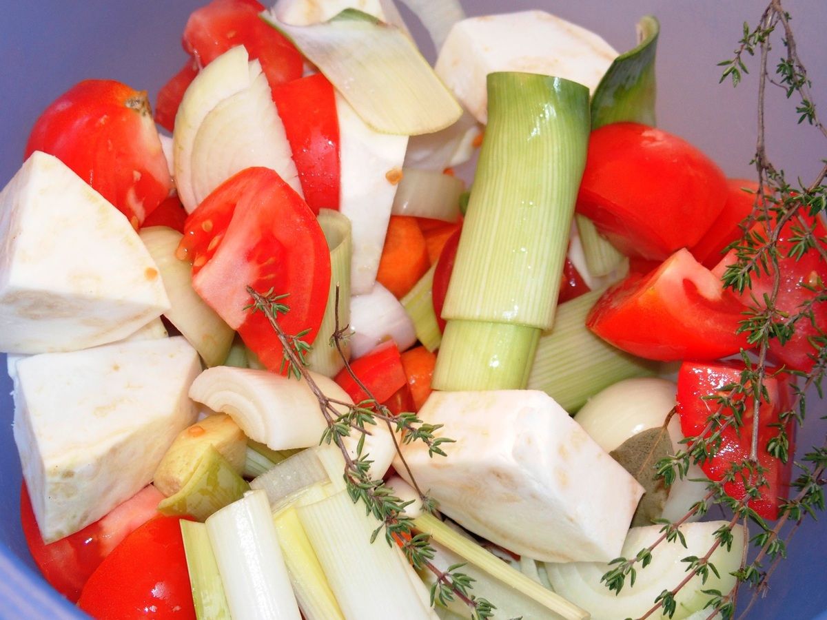 1) Peler les carottes et le céleri et couper en gros morceaux. Peler l'oignon, le couper aussi grossièrement. Enlever la peau des gousses d'ail. Couper les tomates en gros dés. Peler le gingembre et le couper en quatre. Enlever les feuilles vertes du poireau, le rincer sous l'eau froide et couper le blanc en tronçons. Peler le petit oignon et le piquer avec le clou de girofle à travers la feuille de laurier. Mettre tous ces légumes dans un plat avec les branches de thym.