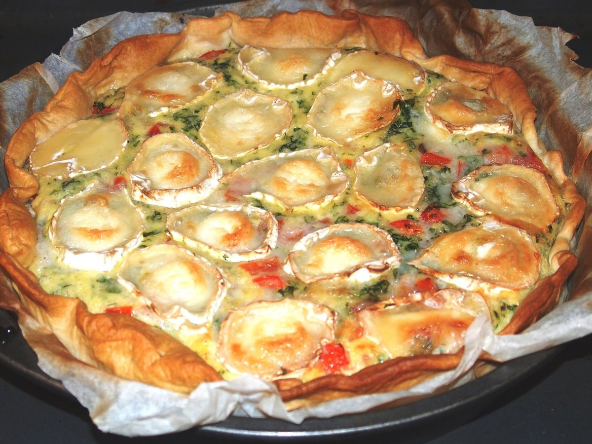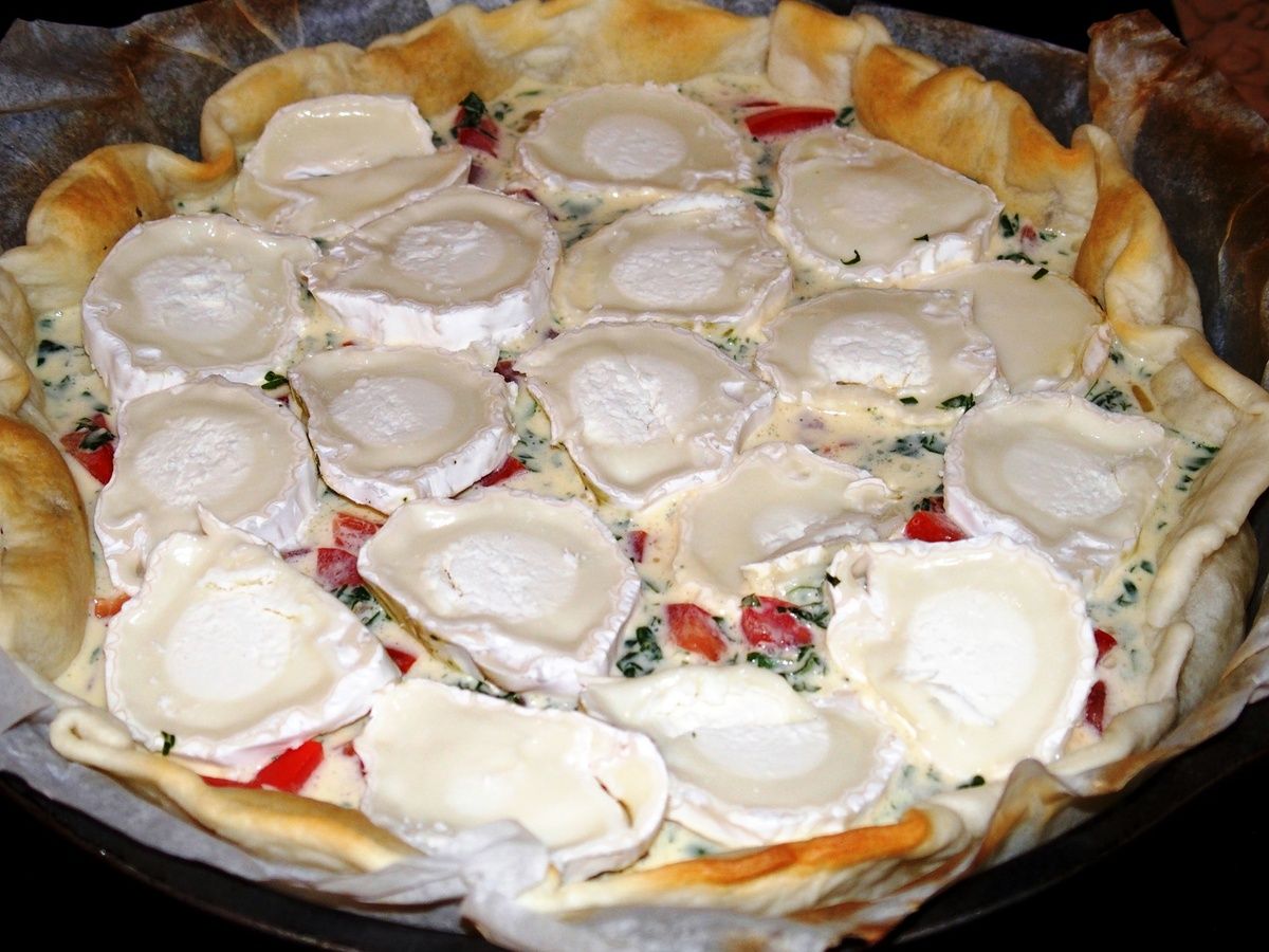 5) Baisser la température du four à 200°C. Sur le fond de la tarte précuite, déposer les lardons et les oignons, puis les dés de tomates. Verser délicatement la liaison. Immédiatement, disposer délicatement les rondelles de fromage de chèvre par-dessus. Enfourner à 200°C dans le bas du four préchauffé pour environ 30 minutes. Sortir et laisser reposer 5 minutes. Déguster avec une salade verte.